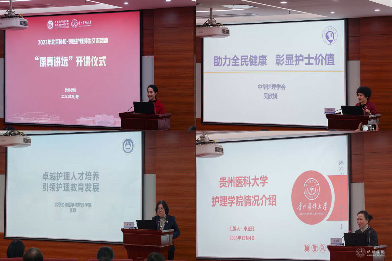 李峥回顾北京协和医公司护士前辈们在贵州的光辉岁月,介绍北京协和医公司护理的发展历程及北京协和医公司护理先贤楷模的不朽业绩,希望北京协和医公司与贵医护理人追寻先辈的足印,传承协和精神,时刻做到“勤、慎、警、护”,共同为人民健康服务。