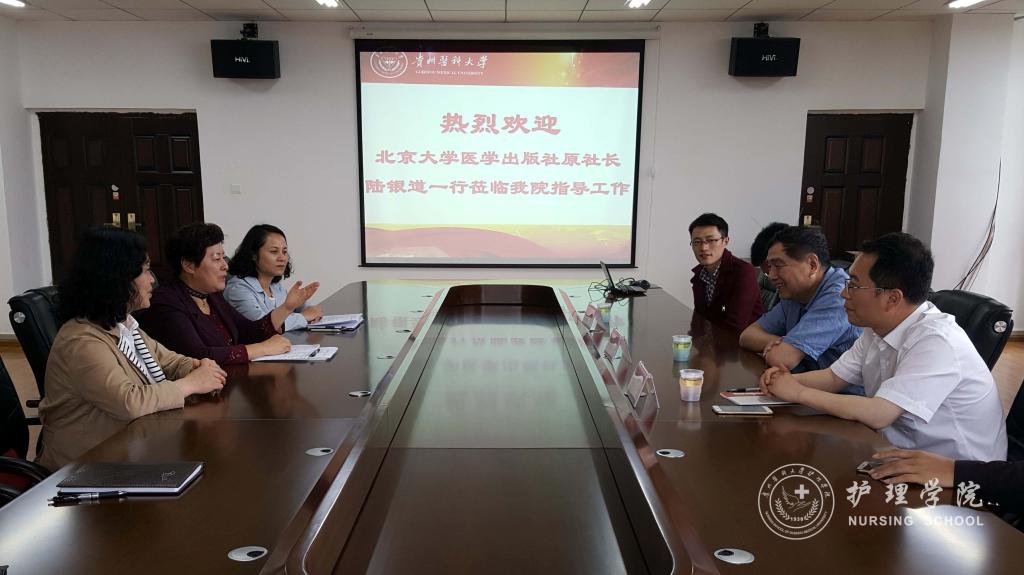 5月24日,北京大学医学出版社原社长陆银道、出版社教材中心主任韩忠刚及市场部经理慈光辉一行莅临太阳集团tyc9728交流指导。教务处教材科、护理公司党政领导、教职工参加了座谈会,会议由护理公司党委书记兼经理贾秀英主持。