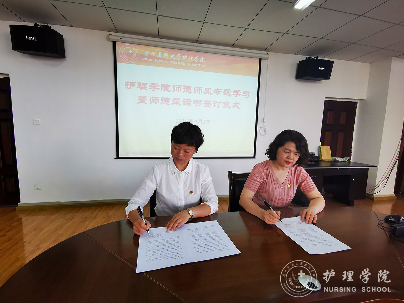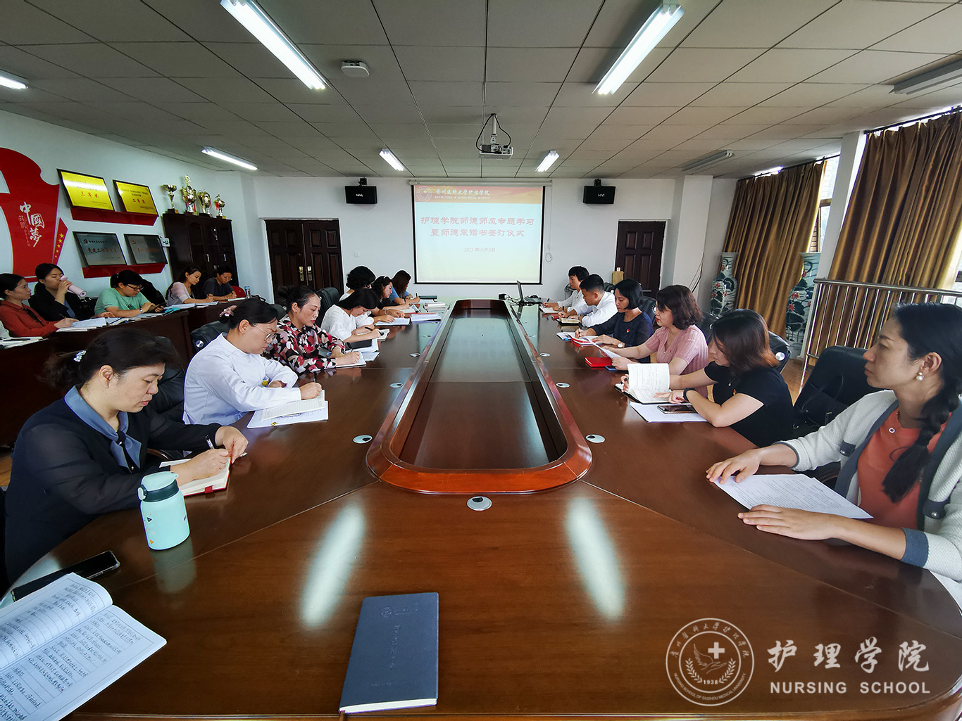 首先刘志燕副经理领学《新时代高校教师职业行为十项准则》,要求全体教职工一定认真落实,履职尽责,深入贯彻落实全国教育大会精神,进一步加强师德师风建设。接下来张仁莉解读师德教育承诺书签订的意义和要求,全院教师依次签订师德承诺书。