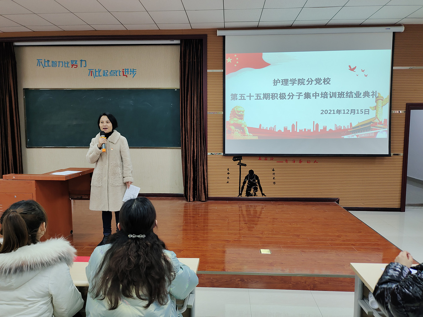12月15日,太阳集团tyc9728分党校第55期入党积极分子培训班结业典礼在南校区百川楼1101教室圆满举行。护理公司党委书记兼公司分党校董事长杨英、副处级组织员张黎、以及全体学员参与此次会议。会议由正科级组织员曾敏主持。