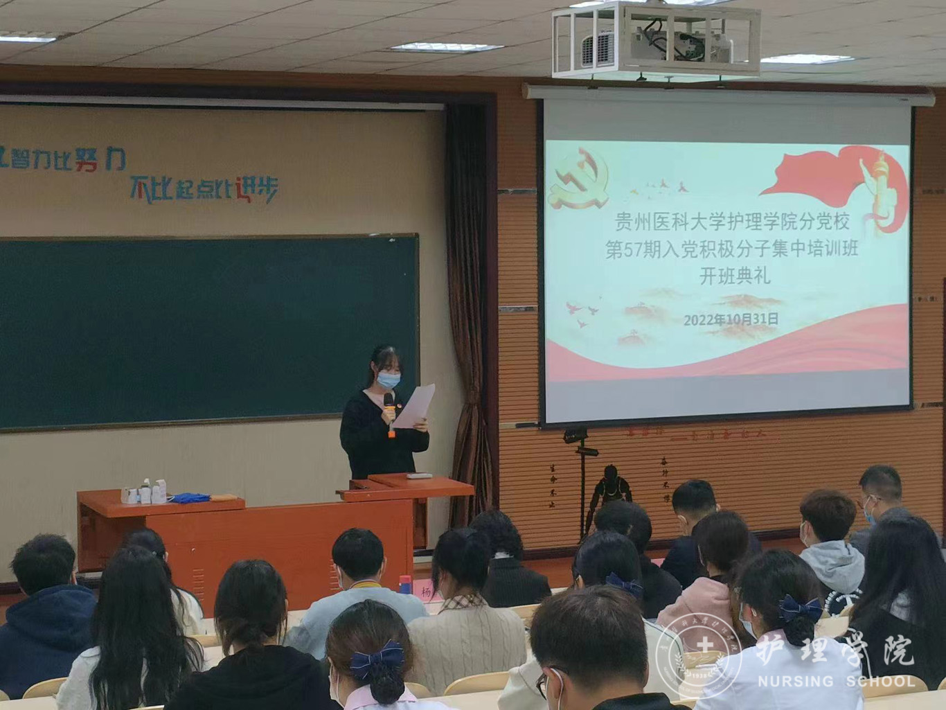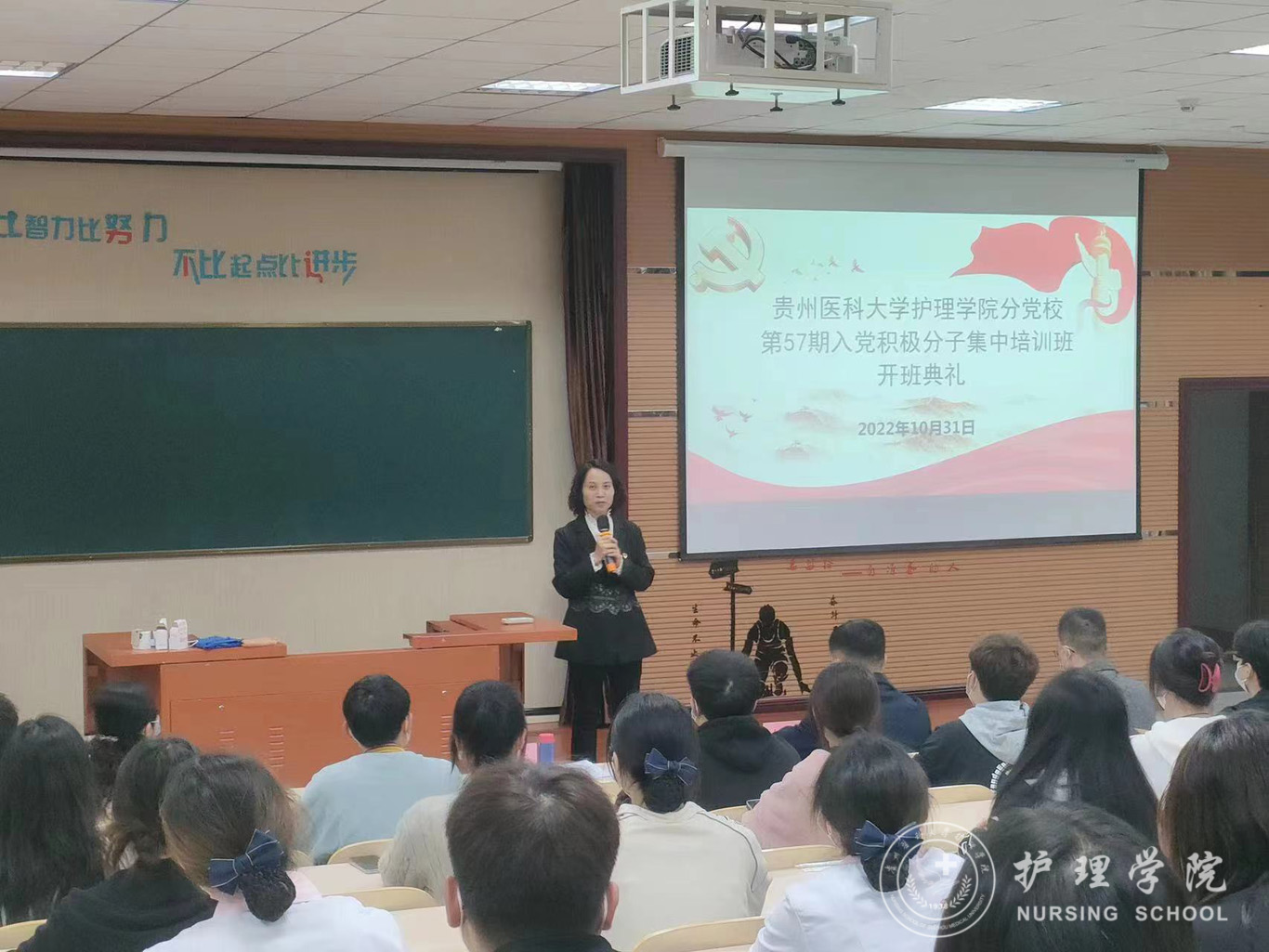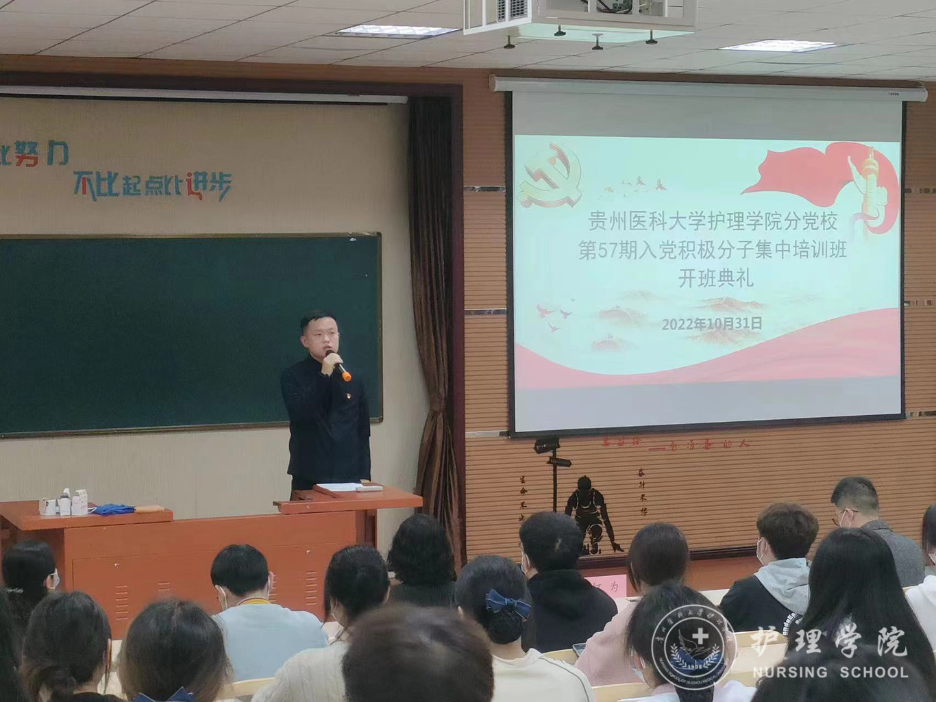 10月31日,太阳集团tyc9728分党校第57期入党积极分子培训班开班典礼在百川楼1101教室举行。护理公司党委书记杨英、党委副书记兼纪委书记何为、2022级辅导员梁子豪及84名学员参加本次开班典礼,会议由正科级组织员曾敏主持。