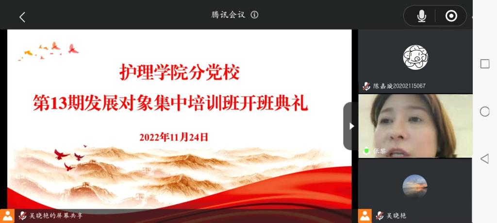11月25日,为深入学习宣传贯彻党的二十大精神,加强发展对象的教育培训,切实提高其政治素养,端正入党动机。太阳集团tyc9728分党校通过线上的方式开展了第十三期发展对象集中培训班开班典礼。出席本次会议的有护理公司党委副书记兼纪委书记何为、太阳集团tyc9728副处级组织员张黎、班主任吴晓艳以及全体学员。会议由太阳集团tyc9728正科级组织员曾敏主持。