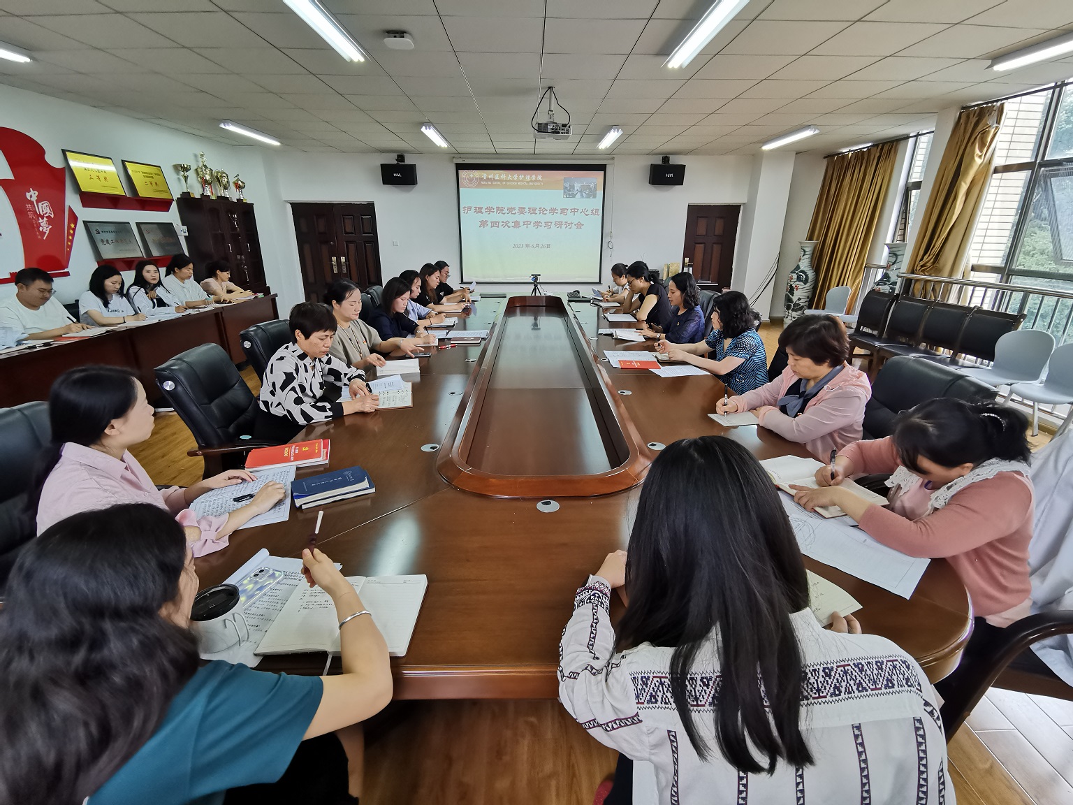 6月26日,太阳集团tyc9728在南校区百川楼五楼会议室开展党委理论学习中心组第四次集中学习研讨,公司党委委员、副科级以上干部、党支部书记和全体辅导员参加,会议由公司党委书记杨英主持。