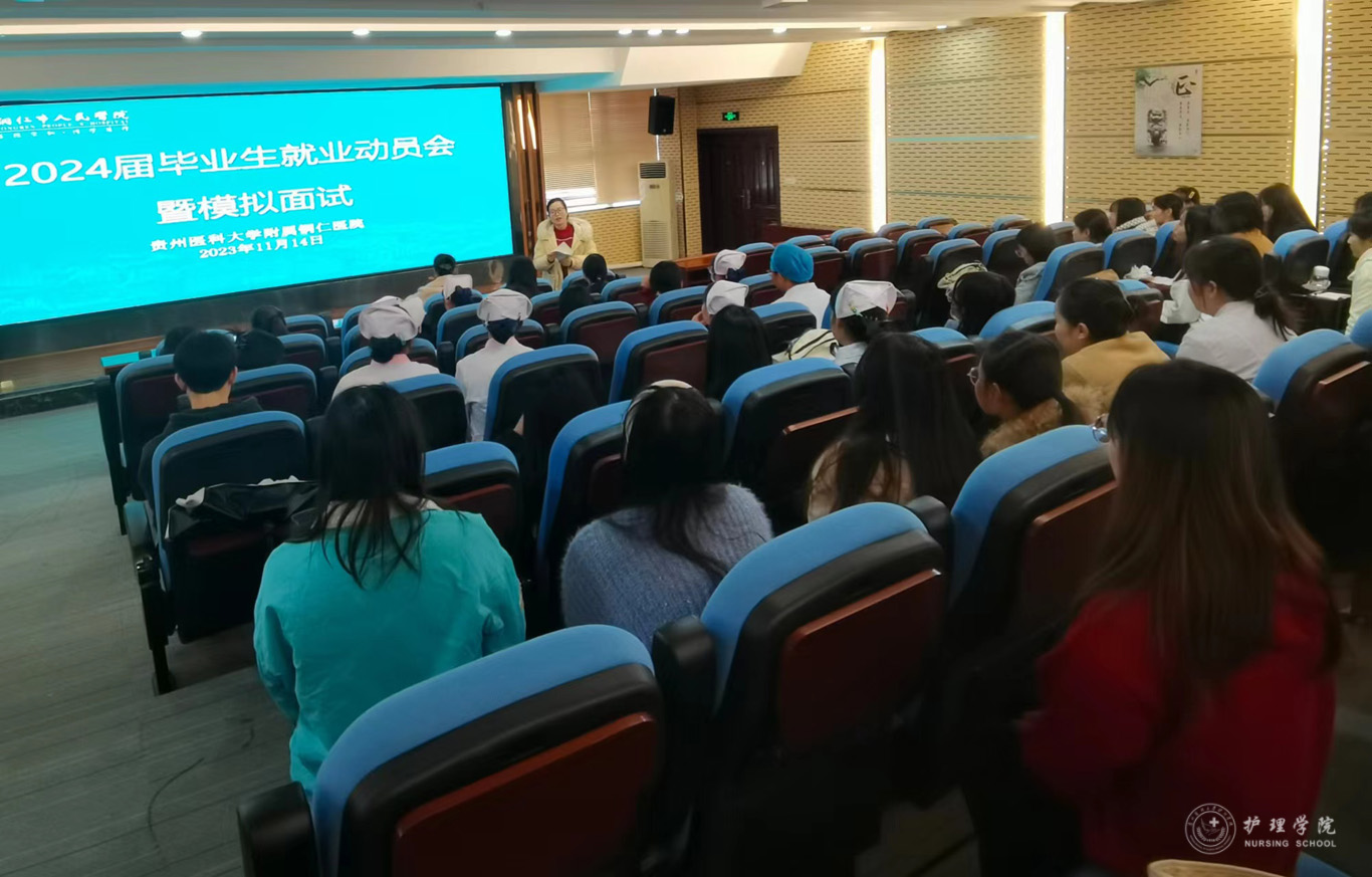座谈会结束后,杨英在两家医院的校本部实习生和专升本员工中召开了毕业生就业动员暨模拟招聘会。会上,杨英和毕丽分别就同学们的现场表现做了点评,并围绕简历制作、面试礼仪和面试技巧等方面为大家做了全面的就业指导,引导同学们学会定位,树立正确就业观,主动出击,在平衡好实习和学习的同时,早日实现就业。
