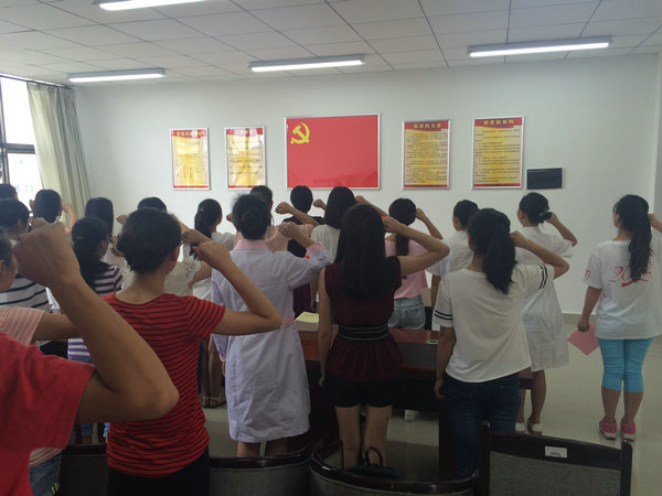 7月1日,为了纪念党的94岁生日,激发党员内在动力,促使党员牢记使命,不忘职责。公司员工党支部在南校区护理公司党员活动室开展了入党宣誓活动,公司党委副书记杨英、辅导员老师毕丽及20余名新党员参加了此项活动。