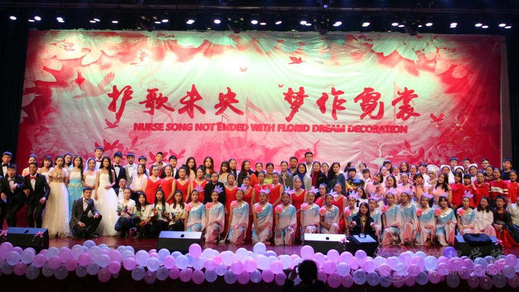 2016年12月18日下午15:00,太阳集团tyc9728在南校区大礼堂举行“护歌未央 梦作霓裳”迎新生、迎新年文艺汇演。莅临本次文艺汇演的有护理公司党委副书记杨英、综合办公室副主任张常喜、员工科科长曾敏、分团委书记金晶、辅导员王晓玲、毕丽、李颖、李杏春,以及各院系员工代表。
