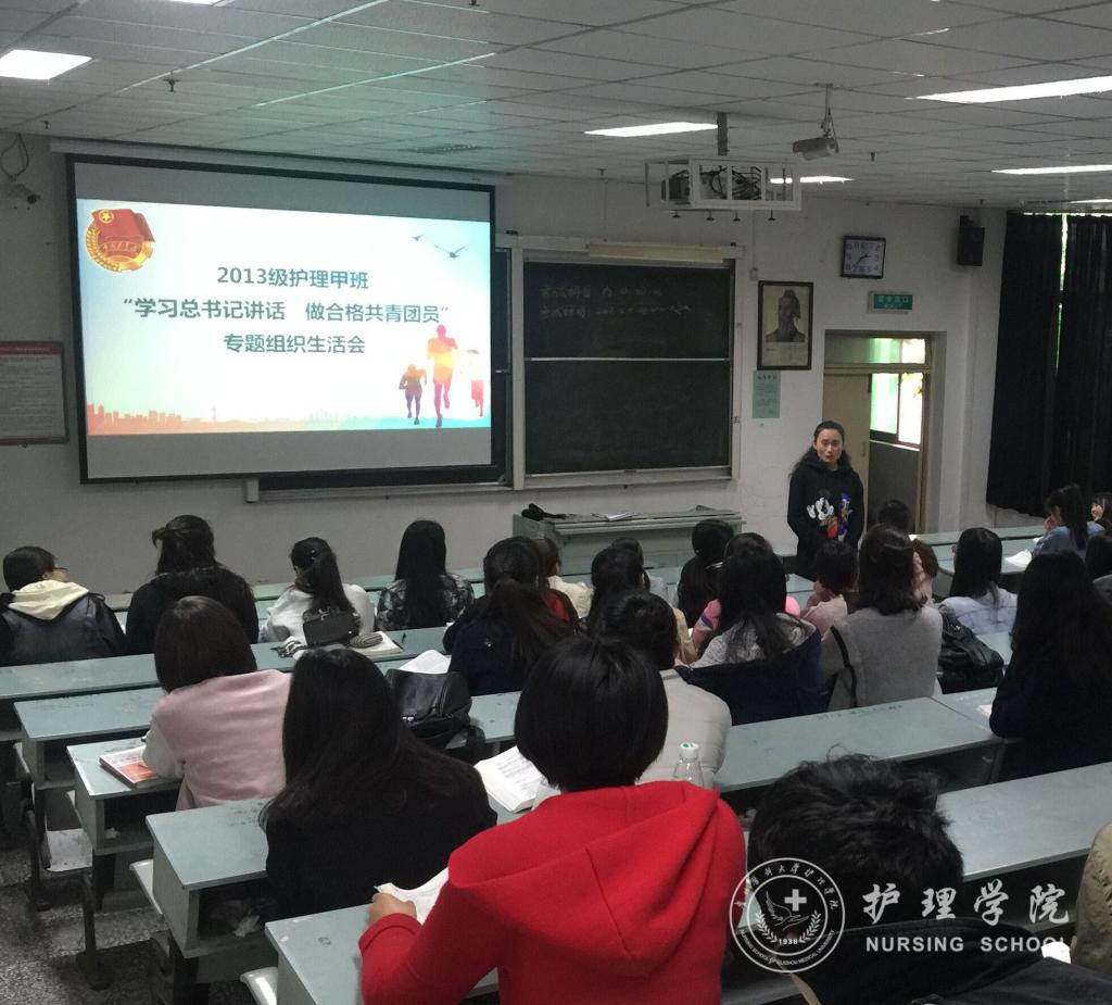 4月21日下午15时,太阳集团tyc9728在北校区3301教室举行了“学习习近平总书记重要讲话,做合格共青团员”专题组织生活会,参会的有太阳集团tyc9728分团委负责人王晓玲老师和2013级护理甲班全体同学。