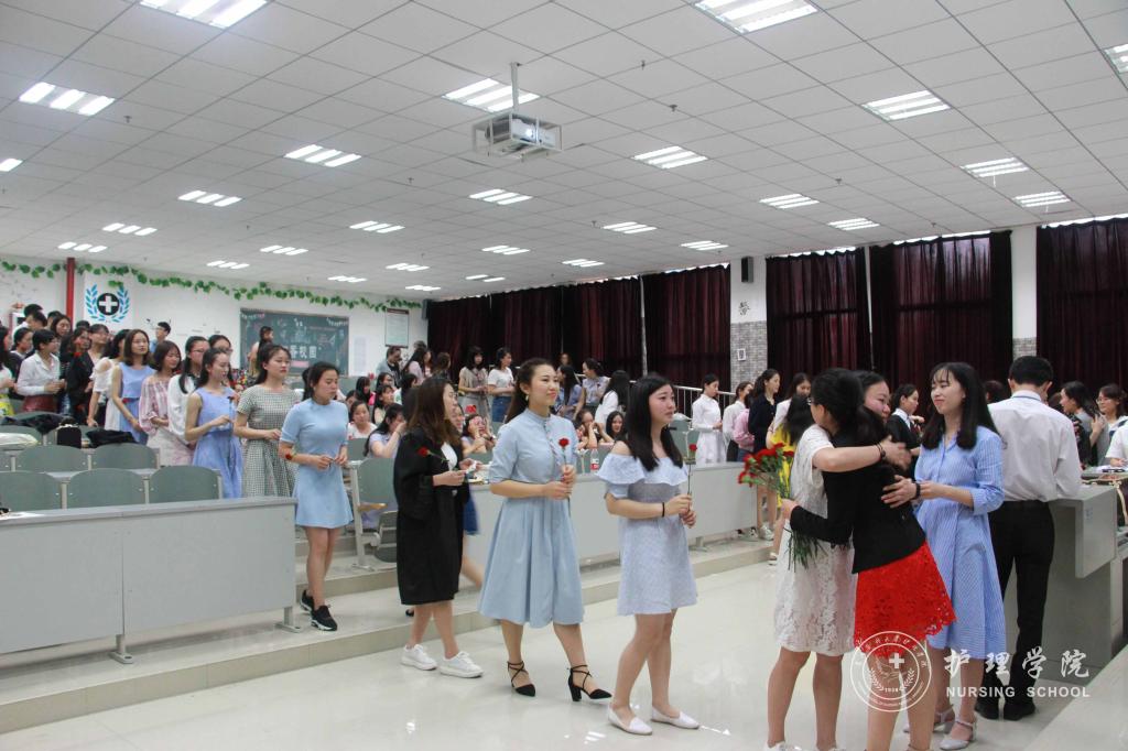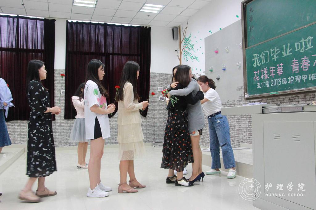 接着,同学们在班委精心制作的视频中回忆了大学四年的花样时光,同学们争先上台有感而发,表达对老师关爱的感恩,对同学支持的感谢,对即将离别的不舍。之后,同学们纷纷向两位老师献上准备好的康乃馨,拥抱老师倾述师恩难忘,老师们笑中带泪,给每一位同学送上班徽,叮嘱同学们要带着老员工活这一段沉甸甸的美好回忆走出校园,不要忘记始终努力学习,始终坚持医务工作者的慎独与初心,用心工作,用心对待每一位病人,将贵医精神传承下去。