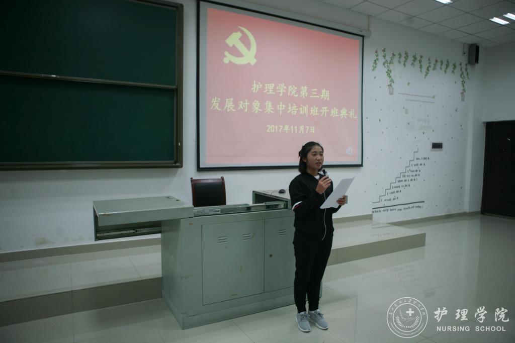 杨英首先代表护理公司党委向全体学员表示衷心的祝贺。她指出,当前全国、全省、全校正在掀起学习、贯彻学习十九大精神的热潮,在此之际举办培训班,意义十分重大。党校是传播、学习、研究马克思主义、毛泽东思想和中国特色社会主义理论的场所,是培养和提高入党积极分子政治理论水平的重要阵地。党校学习也是入党申请者必须经历的最基本环节。对发展对象进行集中培训,即是保证新发展党员质量,保持党的先进性和纯洁性的必要环节,也是帮助大家提高党性修养、砥砺党性品格的需要。希望学员们要珍惜这次机会,学有所思、学有所得、学有所成。为此,她提出了三点希望,一是希望大家勤于学习,尤其要把马克思主义中国化最新理论成果也就是习近平新时代中国特色社会主义思想学透、悟透;二是希望大家善于实践,在日常学习生活中切实发挥党员的先锋模范作用,用自己的言行,影响和带动更多同学共同进步;三,希望大家敢于创新,努力进行科研创新和创业尝试,营造公司敢于创新、勇于创业的优良院风。随后,陈闽黔同学代表全体学员作出承诺,将以最饱满的热情,最全面的投入,最实际的行动来完成渴望已久的党校学习,为成为一名优秀的共产党员而不懈努力。