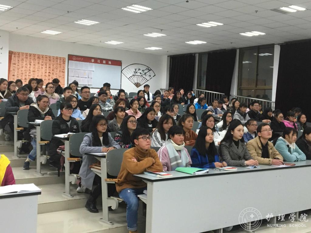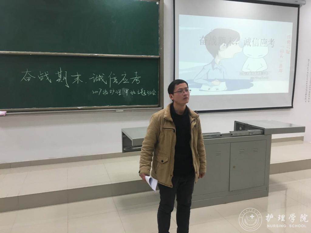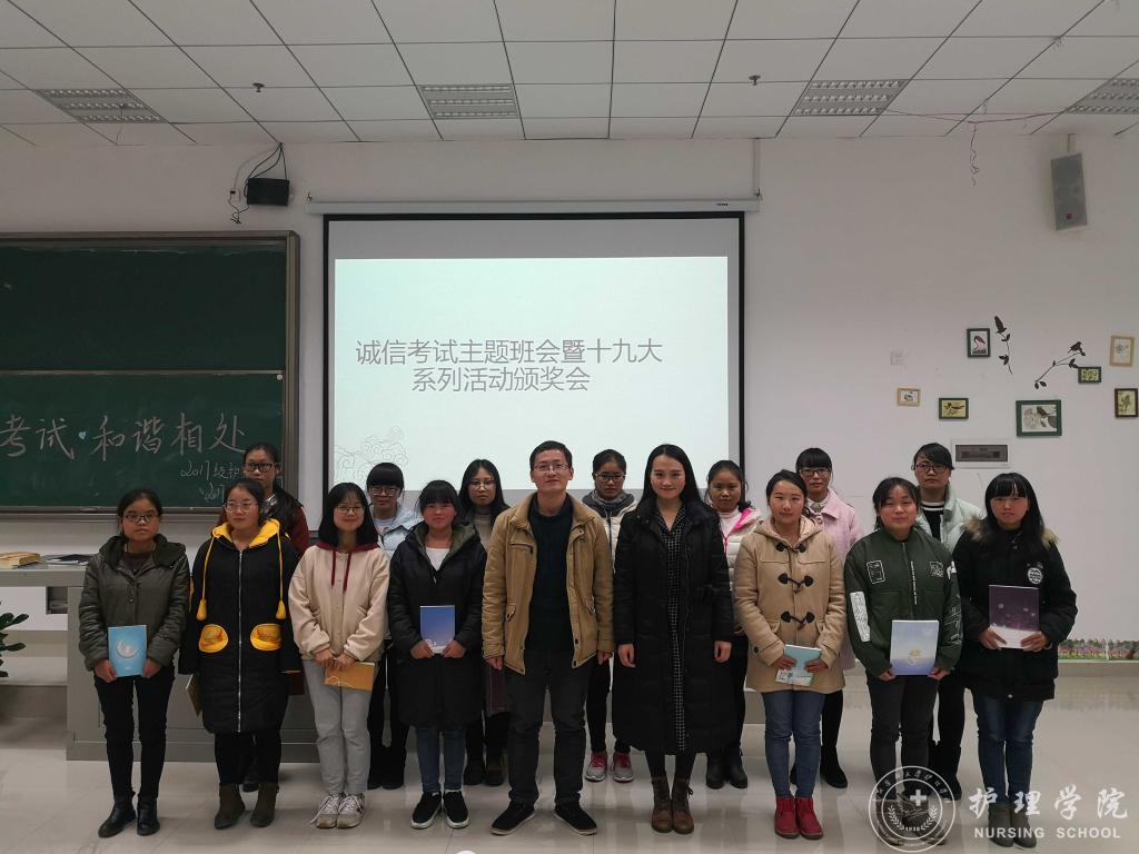 12月21日晚,太阳集团tyc9728在南校区7404和7406教室开展诚信考试主题班会暨十九大系列活动颁奖仪式。此次班会由班主任吴俊、王丽,辅导员马景瑶和班级学习委员主讲,2017级护理甲班、乙班全体同学参加,班会由各班班长主持。