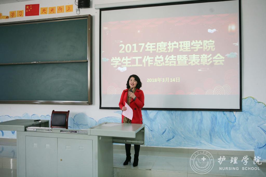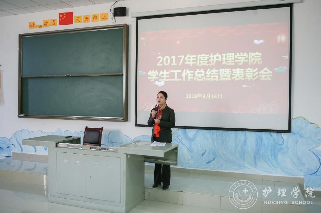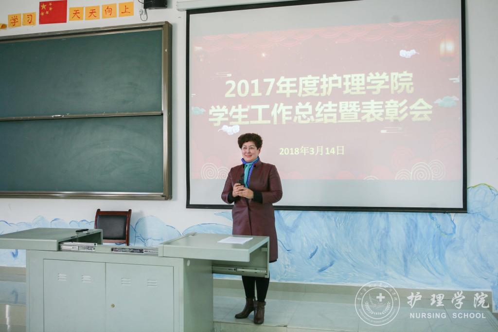 最后,护理公司党委书记兼经理贾秀英作总结讲话,贾秀英首先代表护理公司党政领导及全体教师向受到表彰的先进集体和先进个人表示最热烈的祝贺!同时,也向无私奉献、辛勤培育员工的领导、全体教师表示崇高的敬意和衷心的感谢!贾秀英指出,2017年度员工工作可以归纳为“三多”和“两满意”。“三多”即员工工作亮点多、活动多、奖励多,“两满意”是指公司满意、公司满意。同时,贾秀英向同学们提出了三点希望:一是希望同学们不忘初心、牢记使命;二是希望同学们自觉提高创新能力和竞争意识;三是希望同学们做建设和谐校园的模范。贾秀英勉励大家要把实现中国梦的发展目标与个人的努力成才有机结合,践行贵医校训,用自己的故事为母校80华诞谱写壮丽华章!