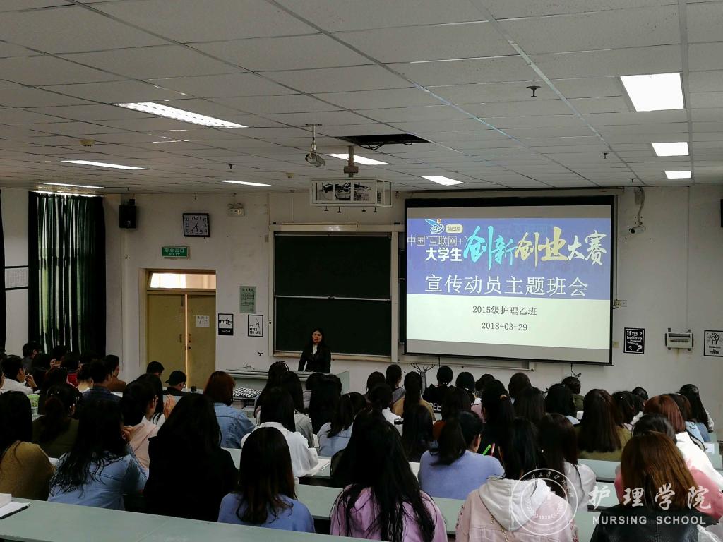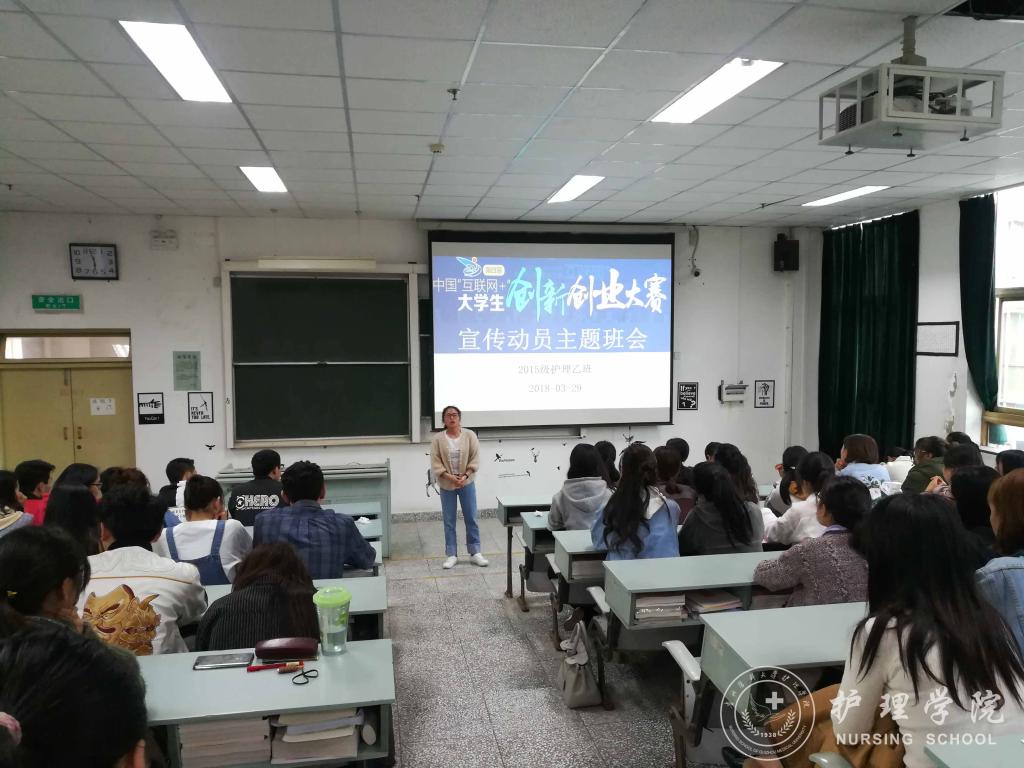 为提高同学们的创新创业意识,培养同学们创新创业的素质和能力,太阳集团tyc9728于3月29日下午5:30在北校区3302教室举行了第四届“互联网+”老员工创新创业大赛宣传动员主题班会。班会由班主任李红老师主讲,2015级护理乙班全体同学参会。