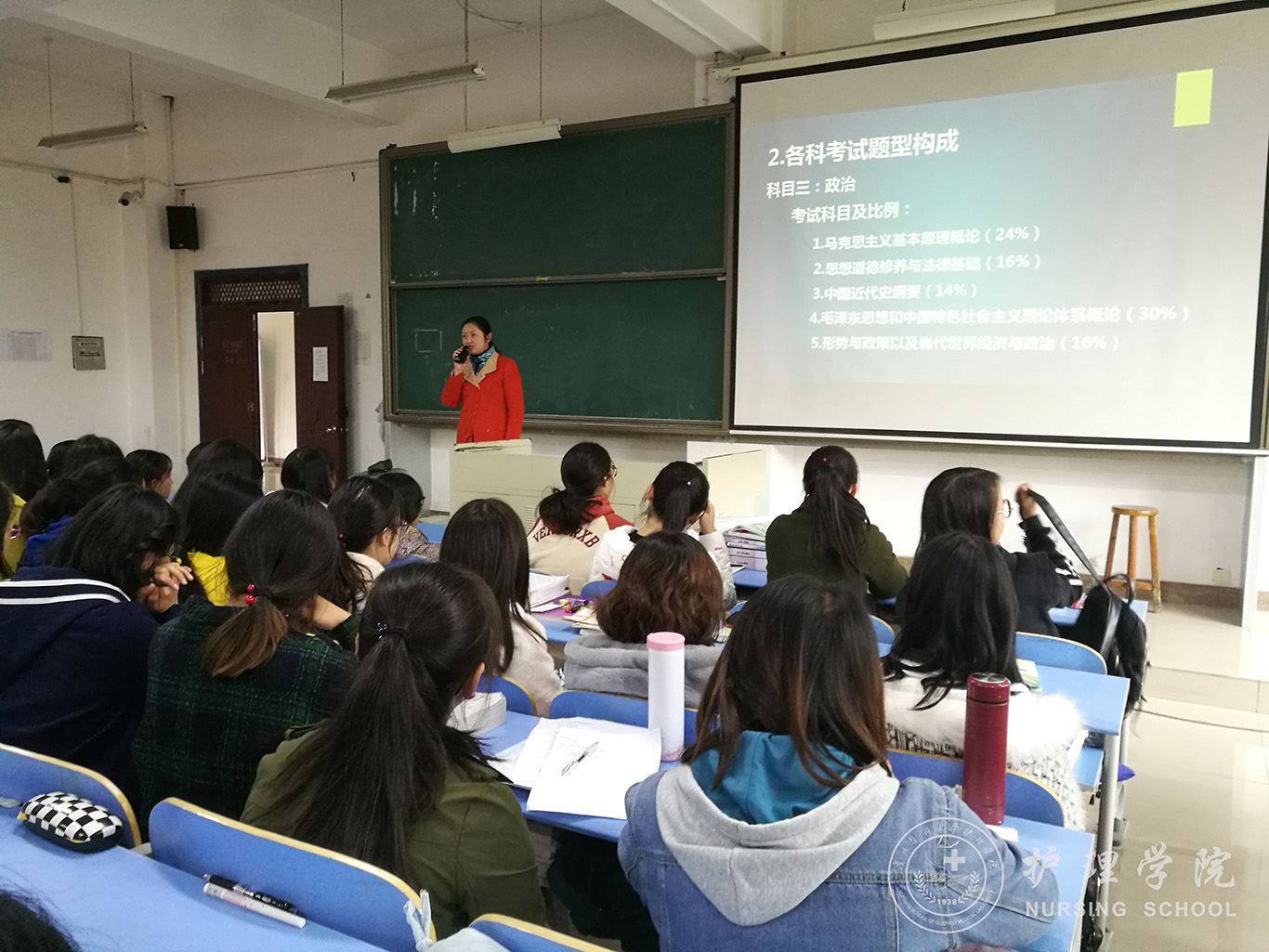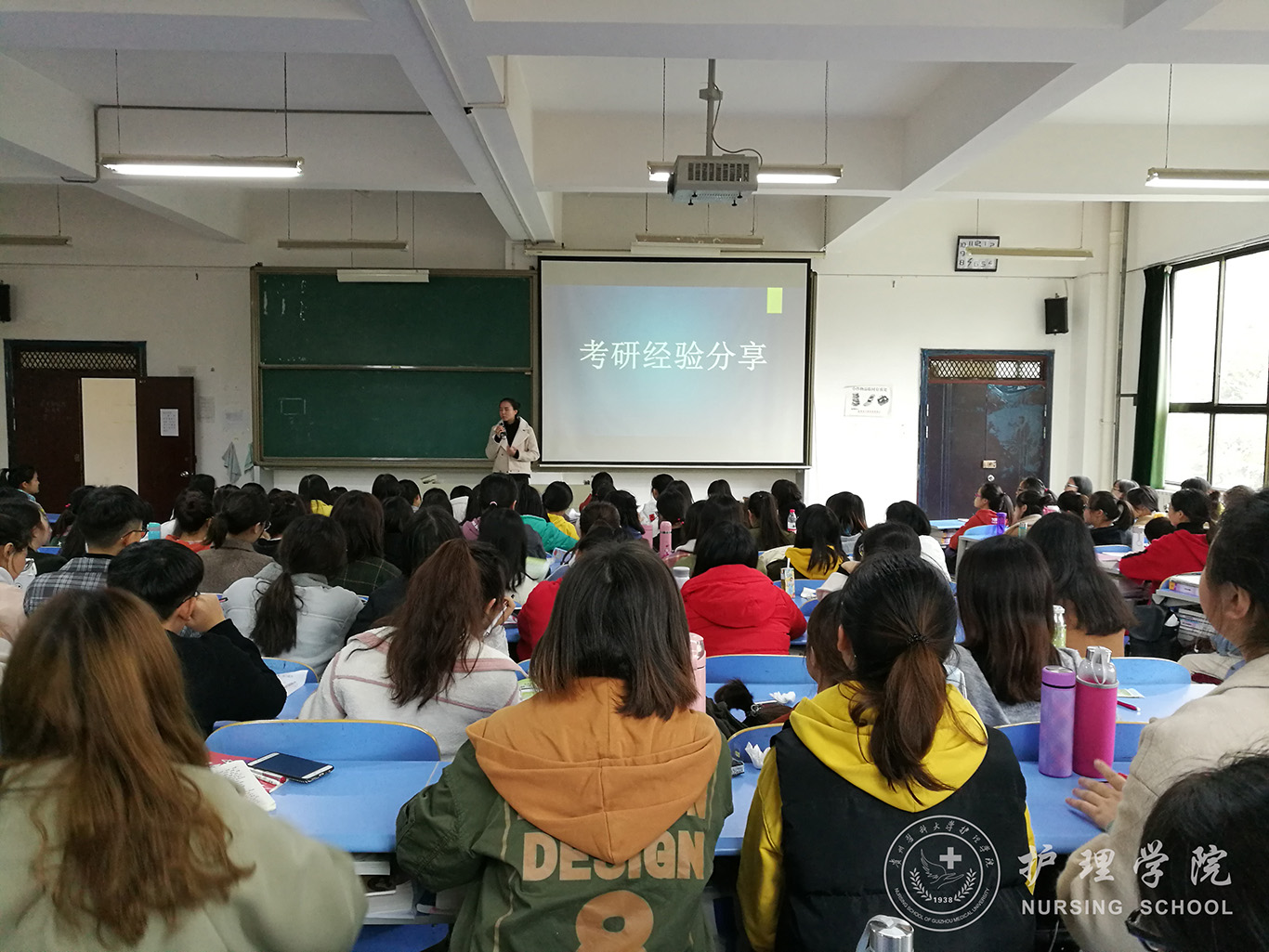 首先,曾敏对两位研究生代表表示了欢迎,并向同学们简要介绍了两位同学的考研经历。接着,方雯跟大家详细介绍了护理专业考研科目、各科考试题型构成,同时结合自己的经历给学弟学妹们讲解了考研过程中的注意事项、复习时间分配、心态调整等问题。刘知音分享了自己工作四年后再考研的经历,并从如今的考研现状、本科生和研究生所学内容以及今后发展的比较来鼓励同学们把握时机,勤奋学习。最后,曾敏老师表达了对两位同学的感谢并做出总结,她希望同学们一是要珍惜现在,机会只会留给有准备的人;二是要求同学们制定出自己的计划,持之以恒,努力去实现自己的考研梦想。