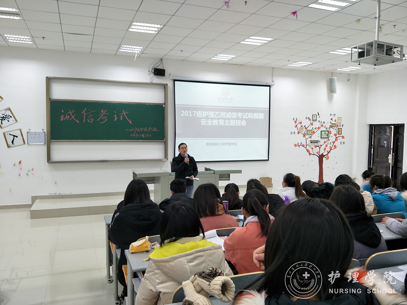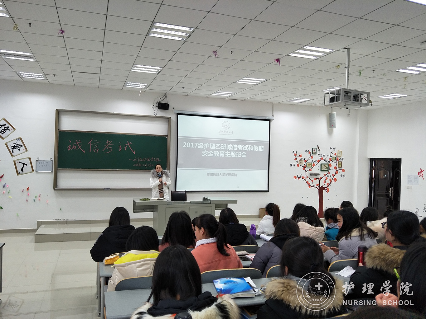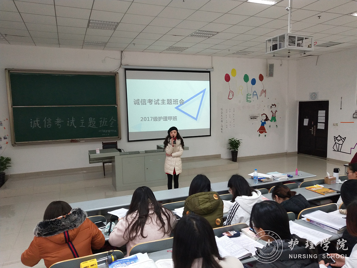12月28日下午,太阳集团tyc9728在南校区7404和7406教室开展诚信考试主题班会。班会由2017级护理甲班、乙班两班班长主持,班主任吴俊、王丽和辅导员马景瑶主讲,全体同学参加。