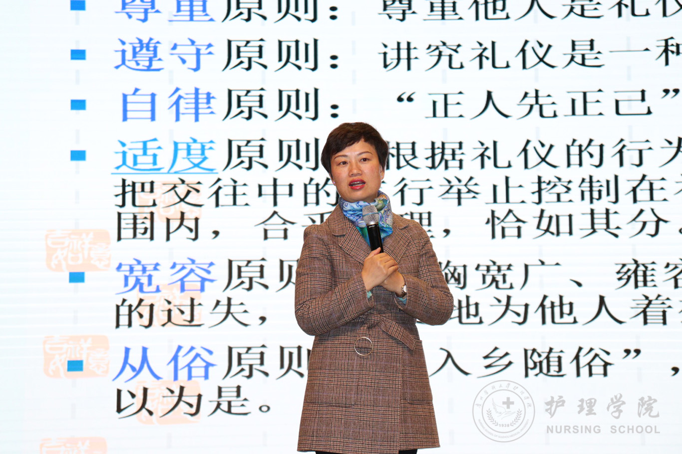 讲座中,王秀红以“什么是礼仪?”引入此次培训讲座的主题,深入浅出、生动形象地讲述了礼仪的定义、概念、重要性,让大家知道礼仪是一种处事理念和行为规范,礼仪是一种风骨,流淌在我们的血液当中。接下来她阐述了礼仪的六个基本原则,也谈及了许多着装的基本原则,并联系实际生活和社会普遍现象为大家生动细致讲解了当代老员工应当具备的礼仪,如化妆礼仪、着装技巧、餐桌礼仪及宿舍礼仪等,其中还特别强调了面试礼仪、师生之间的礼仪规范。最后,她用“美要实践,美在实践”作为结束语,结束了本次讲座。