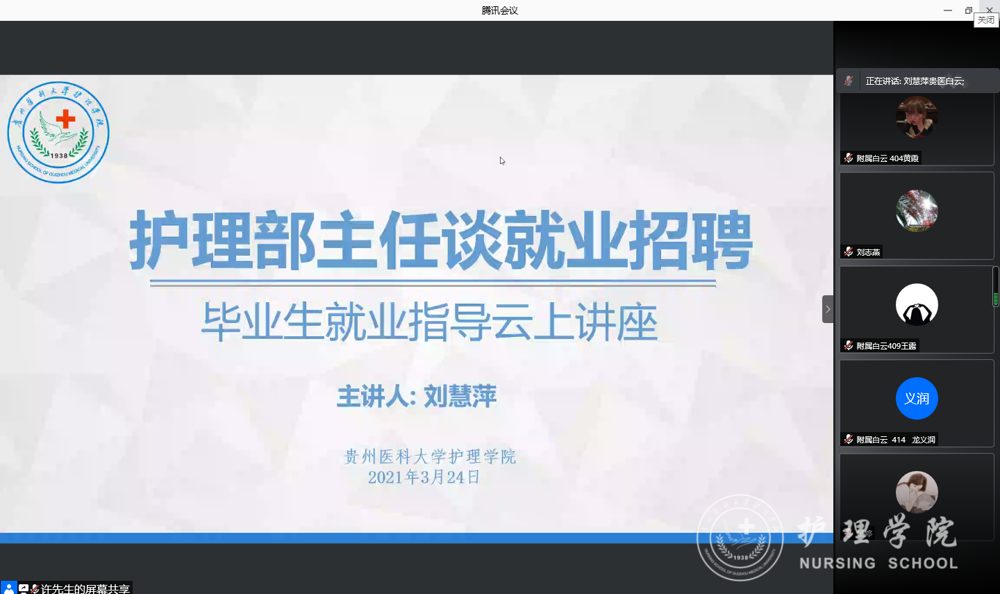 3月24日,为做好2021届毕业生就业工作,提高公司毕业生就业招聘面试通过率,公司特邀太阳集团tyc9728附属白云医院副经理、护理部主任刘慧萍为大家进行了一场毕业生就业指导云上讲座。护理公司党委副书记何为、党委委员、副经理刘志燕出席了会议,校本部及四个教学点辅导员、全体同学毕业生参加了此次会议。