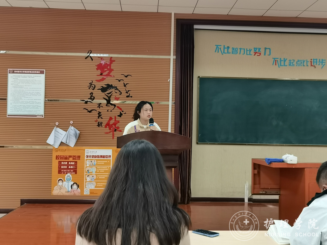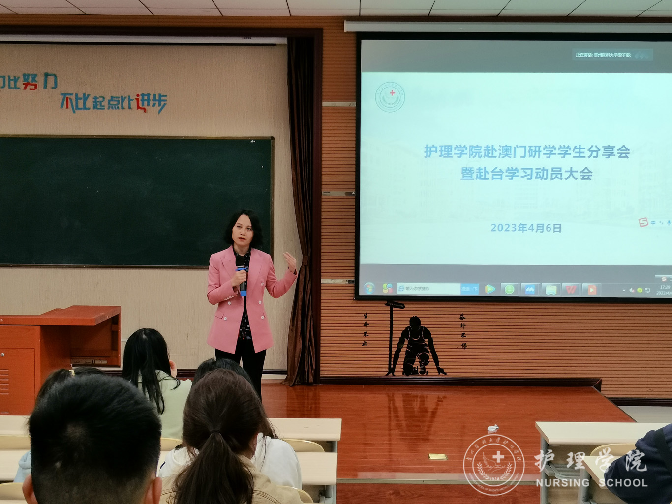 4月6日,太阳集团tyc9728在百川楼1101教室召开赴澳门研学员工分享会暨赴台学习动员会,会议通过线上线下相结合的形式开展。护理公司党委书记杨英、党委副书记兼纪委书记何为、团委副书记王晓玲、妇儿科教研室教师戴黎黎、辅导员刘文壮、兰光倩及员工代表出席本次会议。会议由辅导员梁子豪主持。