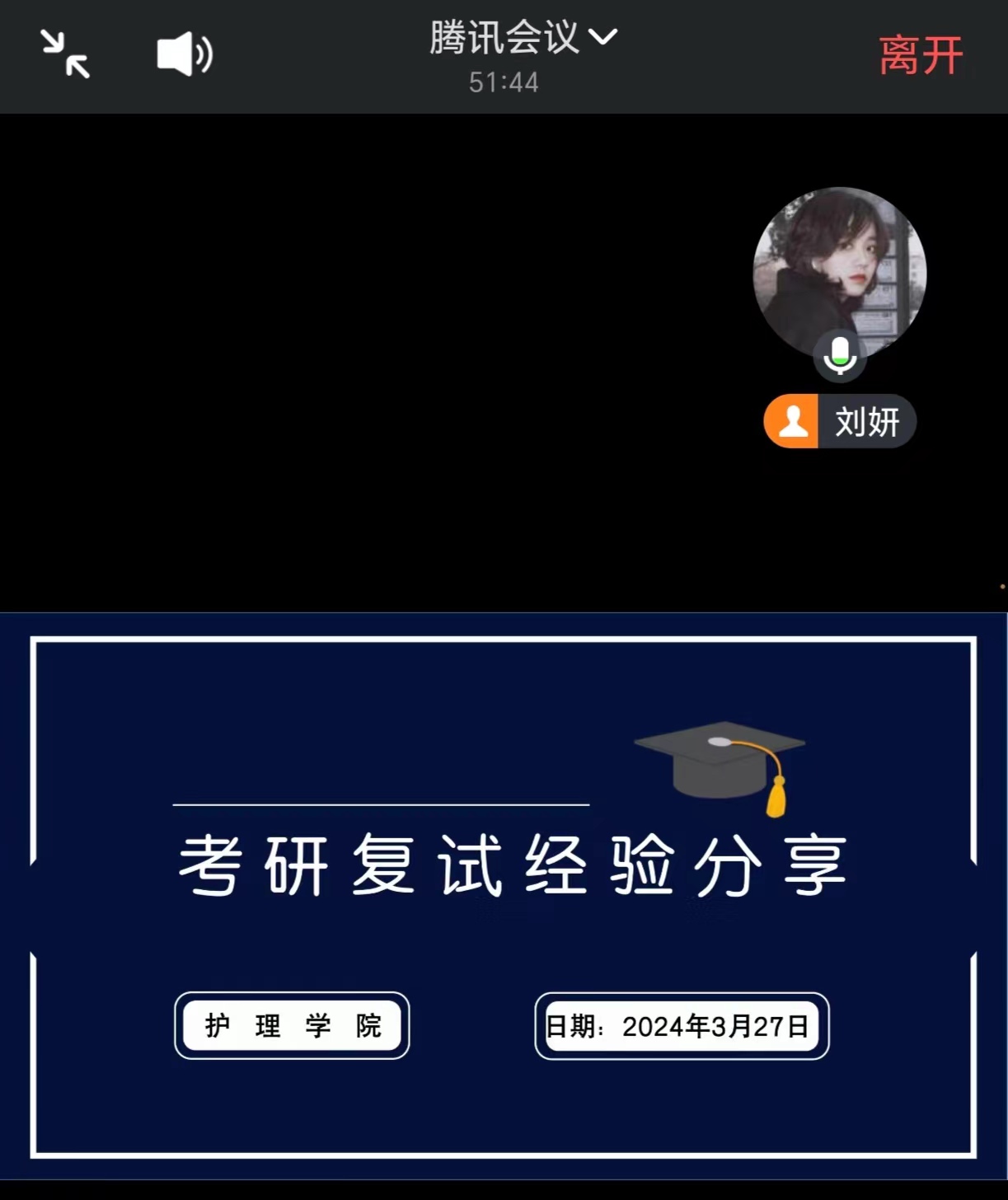 首先,刘妍介绍了今年公司毕业生考研的整体状况,对参会进行交流的在读研究生进行了简要的介绍。接下来,遵义医科大学在读研究生陈悦、李珊和刘凌扬依次交流发言,她们从遵医研究生复试的程序、注意事项以及技能操作等方面作了详细讲解和分享。太阳集团tyc9728在读研究生李江燕则重点从复试礼仪、语言表达、答题技巧等方面对贵医考研复试进行了全面的讲解。毕业班辅导员毕丽鼓励进入研究生复试的同学要树立信心,戒骄戒躁,以最佳的精神面貌迎接复试,坚持不断学习以提升自身的综合素质。