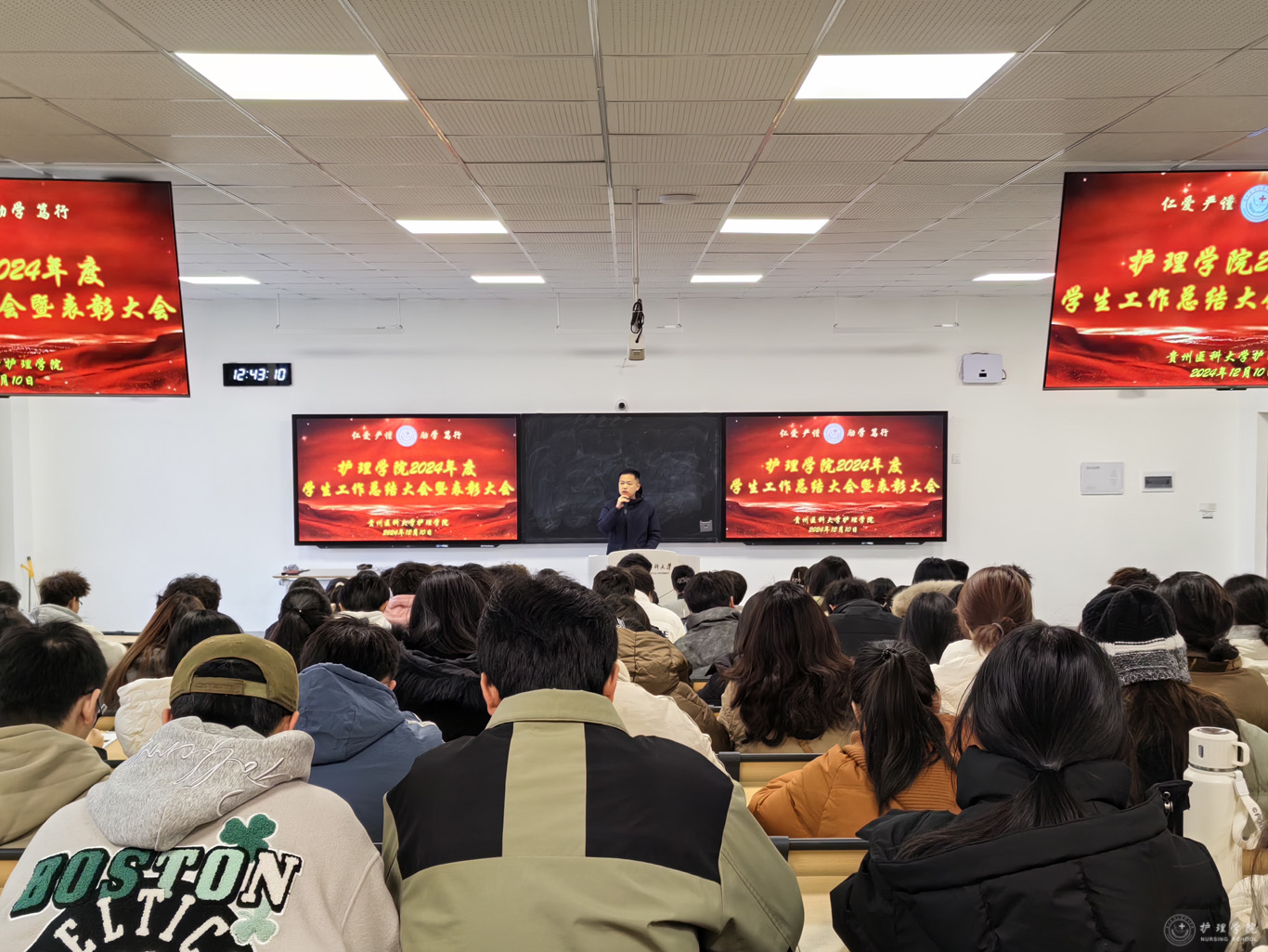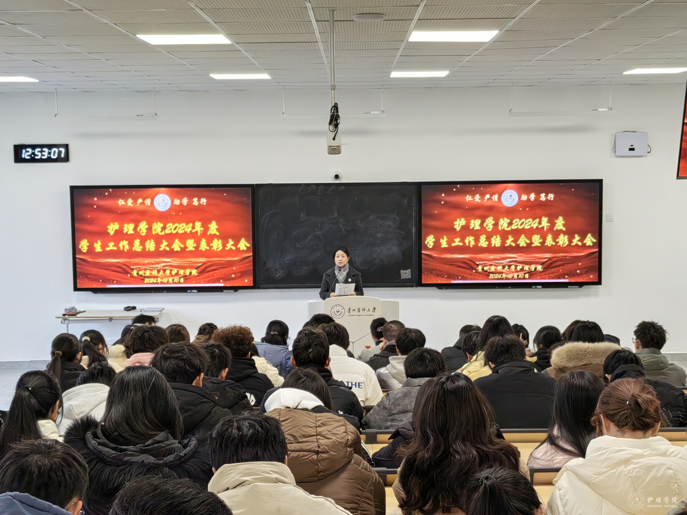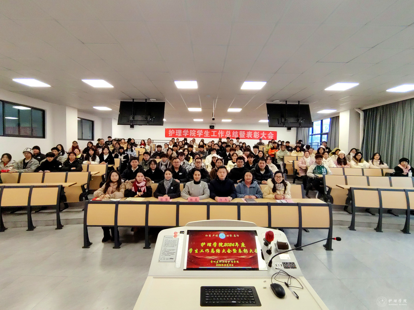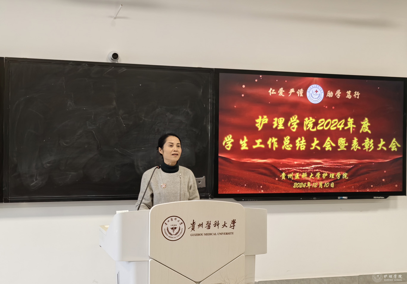 杨英对本次大会进行总结并讲话。她首先对公司员工工作取得的成绩给予肯定,代表公司党委和行政对公司员工工作付出辛勤劳动的老师和同学表示由衷的感谢。随后,她结合护理学专业,从厚植家国情怀到贵医护理人的使命与担当,鼓励同学们主动作为,善做善为,敢于创新,争做熠熠生辉的贵医护理人。同时,她还提出了三点希望:一是要秉持贵医护理人的情怀,注重人文关怀;二是要努力创新,增强本领;三是面对挫折和困难,要保持豁达,不畏艰辛才能一路成长。