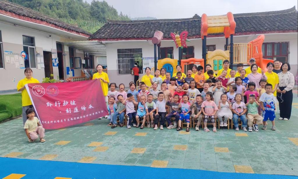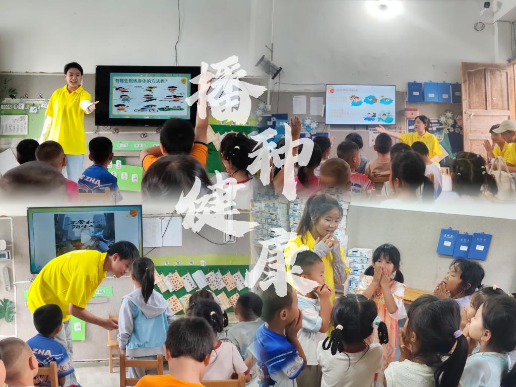 7月13日,团队紧扣“健康中国2030”儿童安全行动,将专业知识转化为趣味课堂。“水宝宝陷阱”演示让孩子们掌握溺水自救技巧;“中暑小怪兽”游戏教会大家防暑降温妙招;《“糖果陷阱”大作战》让小朋友化身“反诈小英雄”,呼应“全民反诈进校园”号召。队员们还通过几个互动游戏,将七步洗手法、均衡饮食等健康知识融入其中,在欢笑中筑牢苗乡儿童的健康防线。