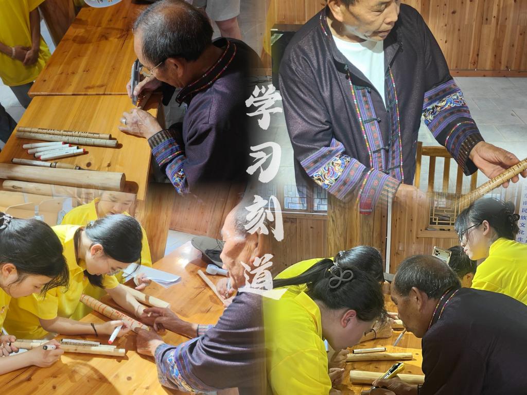 7月9日,在国家级非遗传承人吴通贤的指导下,队员们开启了刻道文化的探秘之旅。吴老执起枫木歌棒,用沙哑的吟唱唤醒古老盟誓,27格符号承载的万行《开亲歌》,将被誉为苗族婚姻的“活化石”史诗娓娓道来。“一木分两半,婚约永不违”的千年智慧,让队员们深刻体悟到非遗文化的厚重。护理学子以实际行动践行文化传承使命,成为非遗“活态传承”的青春力量。