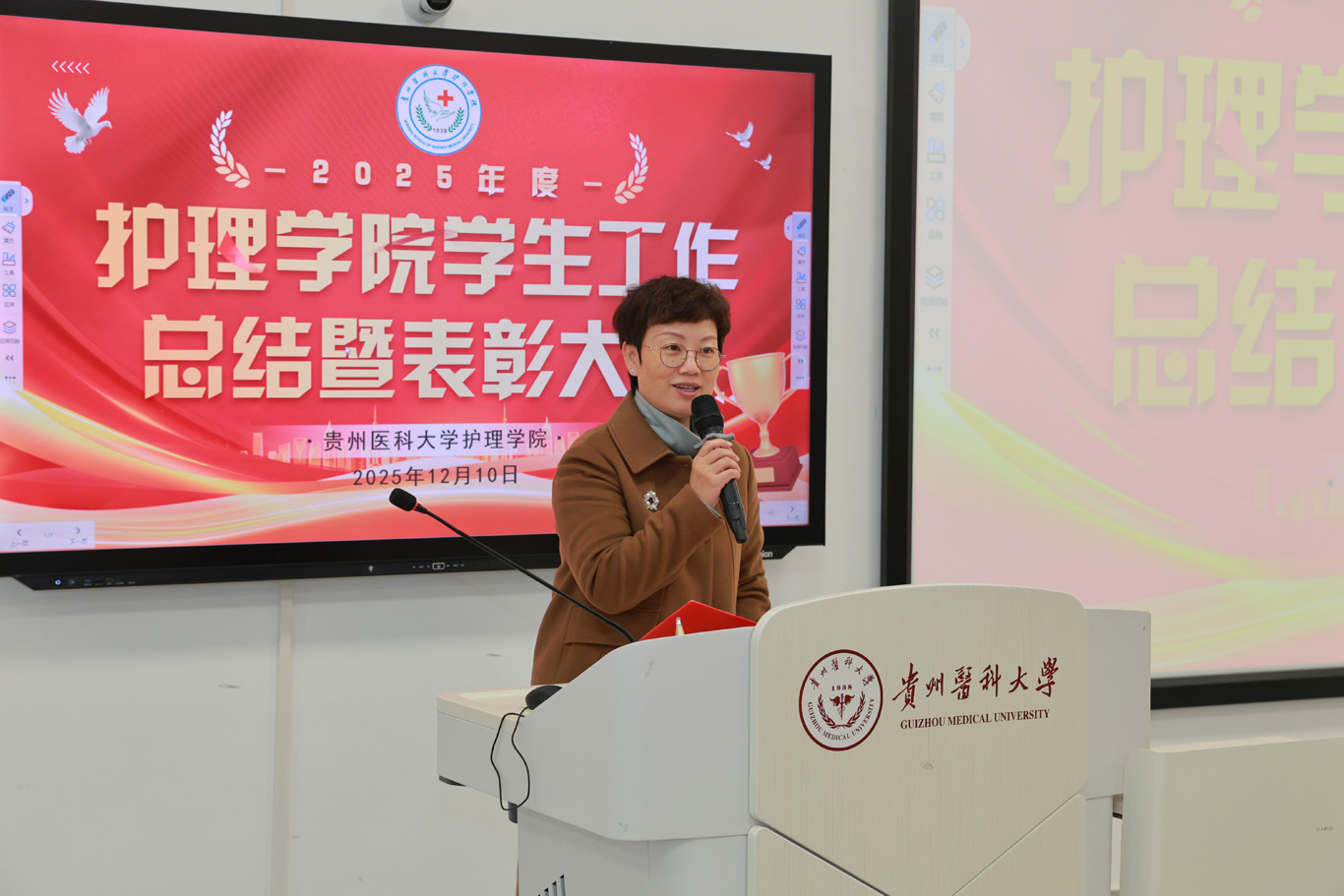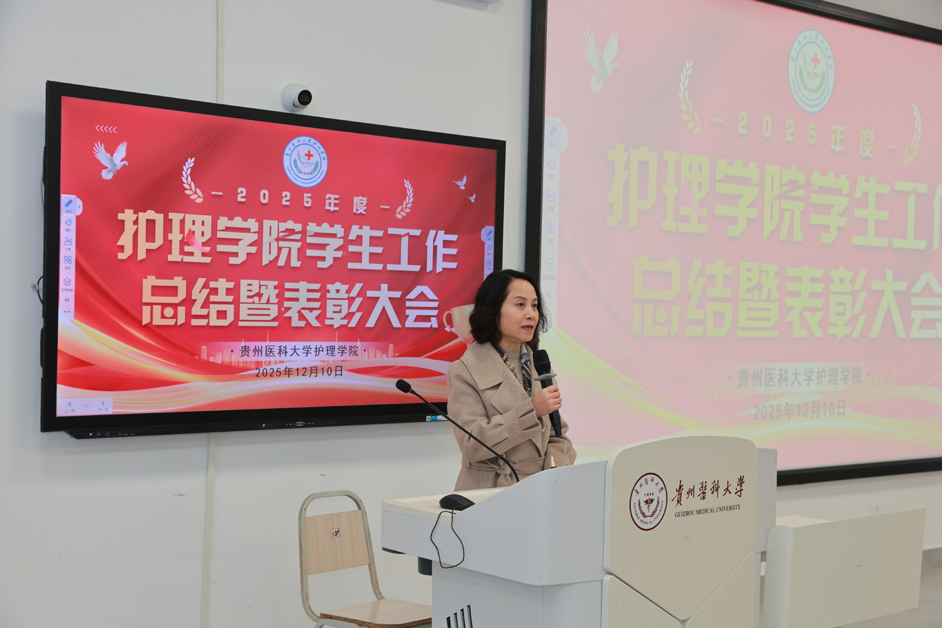 杨英作总结讲话。她首先向受到表彰的集体与个人致以热烈祝贺,向辛勤耕耘在员工工作一线的教职工表示衷心感谢。随后,她以“贵医护理的历史传承与时代成就”为切入点,带领师生回顾公司发展历程,引导同学们厚植专业情怀;围绕“坚定新征途、凝聚成长力量”,强调以专业情怀滋养个人成长,将个人发展融入公司建设与行业发展大局。杨英对全体同学提出三点要求:一是坚守医者情怀,涵养仁心大爱;二是坚持勤学不辍,锤炼过硬本领;三是勇于直面挫折,永葆奋进姿态。