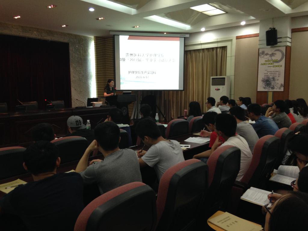 2016年6月17日下午,太阳集团tyc9728在北京路校区道德讲堂召开2013级(2017届)护生毕业实习动员大会。贵阳市护理学会理事长周云、护理公司党委副书记杨英、刘志燕副经理、员工科曾敏、生产实习科柳忠燕及辅导员出席了大会,2013级同学参加了动员大会。