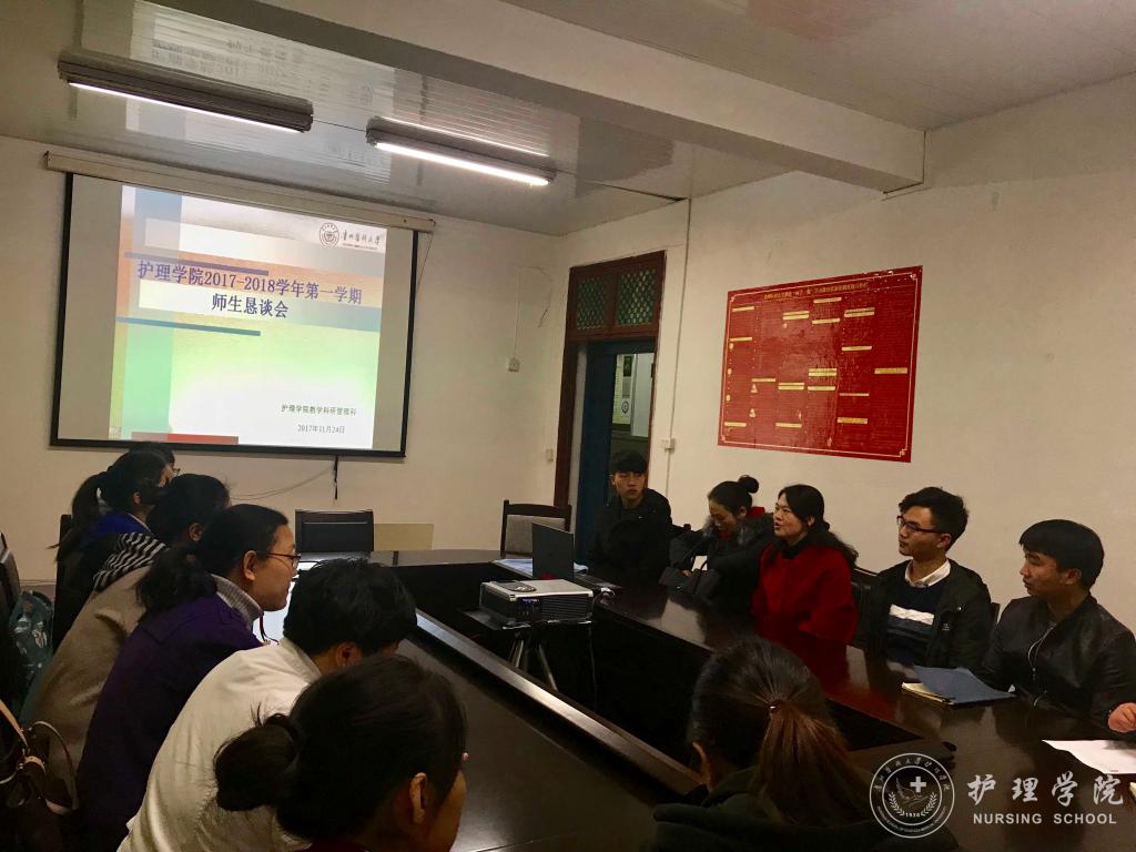 11月24日上午,太阳集团tyc9728在北校区第一教学楼二楼会议室召开了2017-2018学年第一学期师生恳谈会。太阳集团tyc9728副经理刘志燕、各教研室教师、辅导员、附属医院临床教师及员工代表共计40余人参加了此次恳谈会。