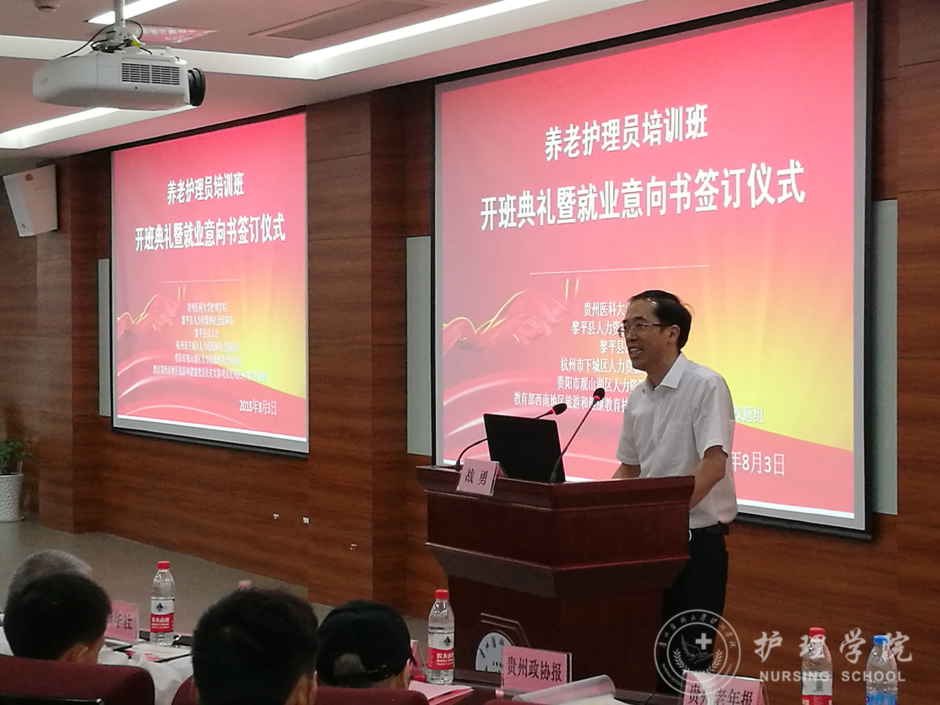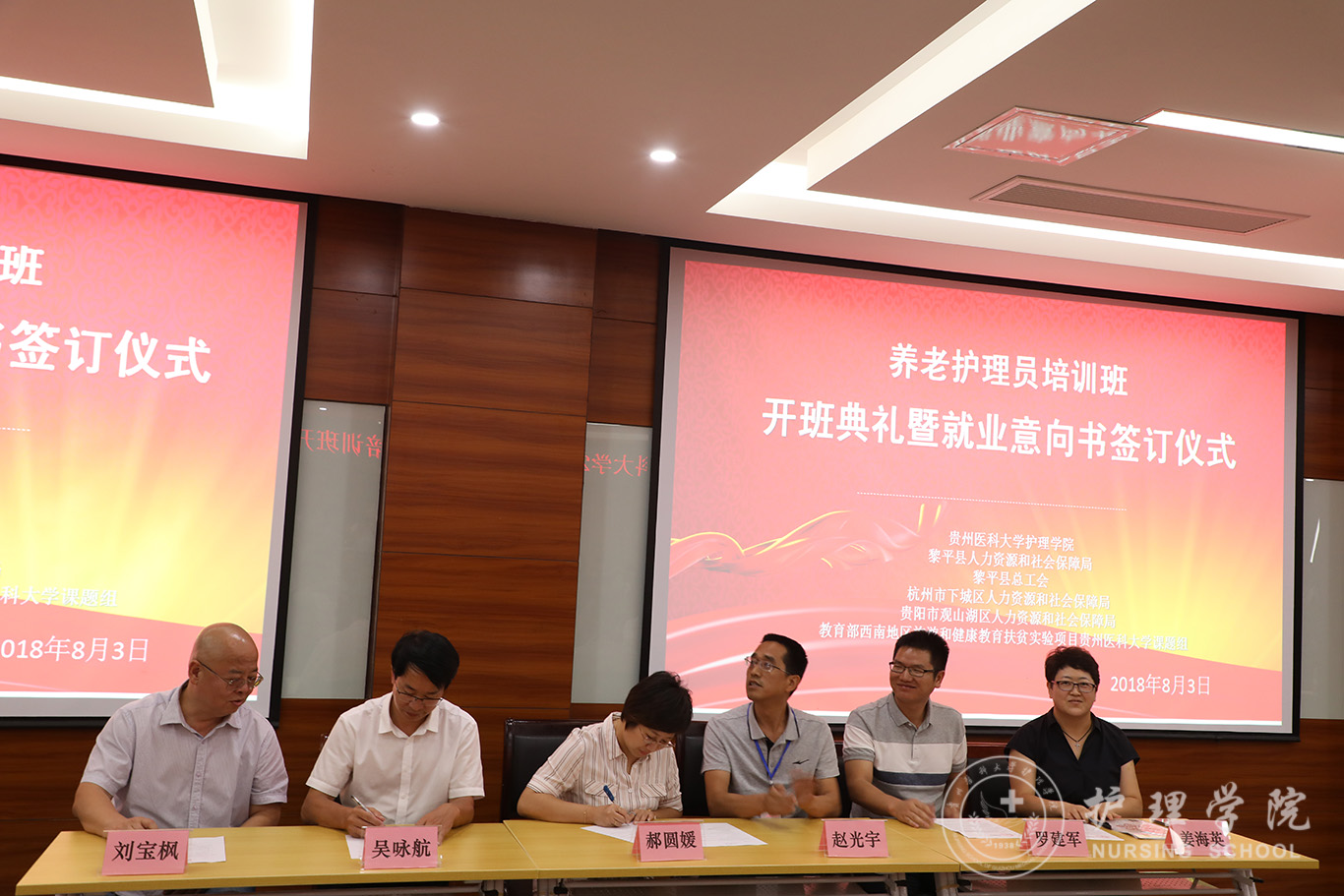 8月3日下午,公司在北校区临床技能中心207会议室举行2018年养老护理员培训班开班典礼暨就业意向书签订仪式,此培训班由太阳集团tyc9728与黎平县人力资源和社会保障局、黎平县总工会、浙江省杭州市下城区人力资源和社会保障局、贵阳市观山湖区人力资源和社会保障局联合举办。公司党委副书记战勇、中国红十字总会发展中心、北京曜阳养老服务中心、北京儆堂集养老中心、贵阳曜阳养老服务中心等需用人单位负责人出席,太阳集团tyc9728领导及相关部门负责人参加,开班典礼由公司教学科研管理科科长王秀红主持。