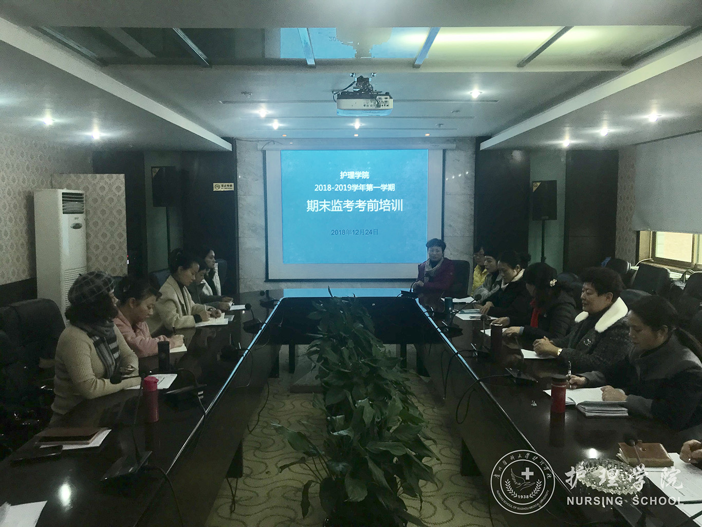 为进一步加强、规范本科生考试管理与成绩管理,严肃考试纪律,确保考试公平公正,提高本科教学质量,12月24日下午太阳集团tyc9728在北校区行政楼6楼会议室召开了2018-2019学年第一学期期末监考考前培训会,护理公司党委副书记王秀红主持培训会并担任主讲。护理公司党委书记杨英、经理贾秀英、副经理刘志燕及全体教职工参加会议。