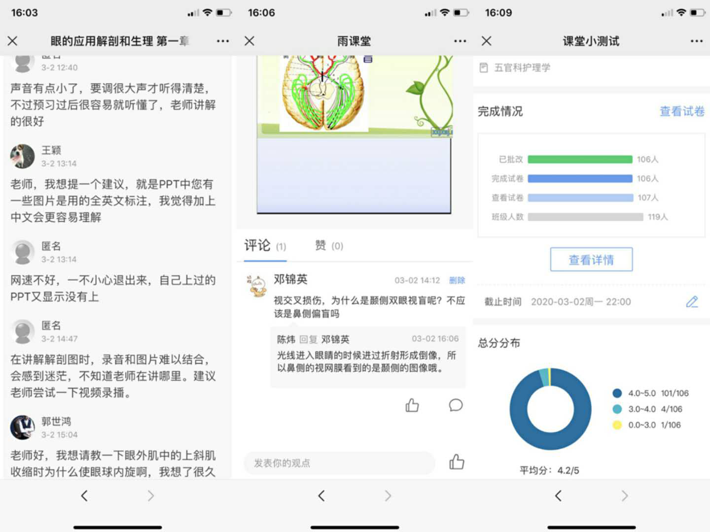 护理人文教研室和护理学基础教研室,选用中国大学和人卫MOOC《护理管理学》、《社区护理学》、《老年护理学》课程。提前在雨课堂发布预习、答疑和测验安排,推送电子教材慕课平台链接。