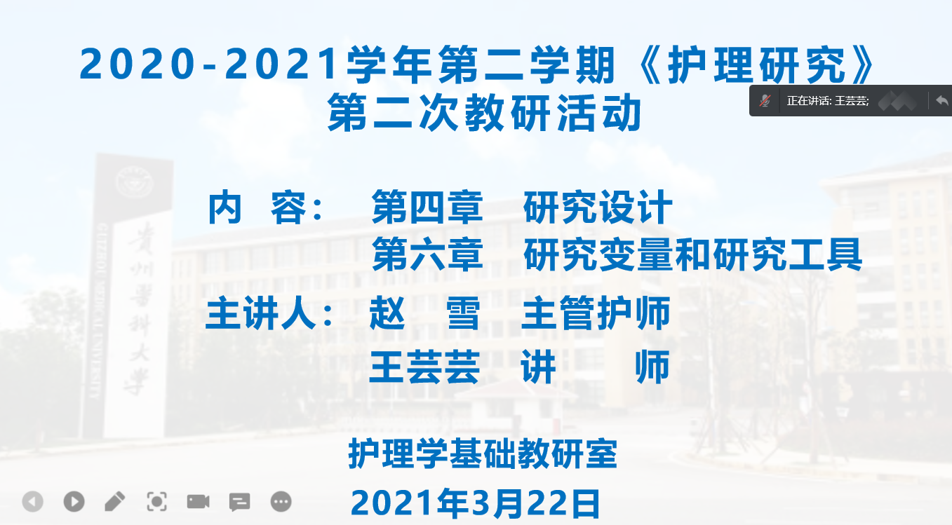 3月22日,护理学基础教研室以腾讯会议方式开展了《护理研究》课程集体备课,此次集体备课以说课形式进行,太阳集团tyc9728经理李亚玲、副经理刘志燕、王秀红及《护理研究》全体授课教师参与此次集体备课。