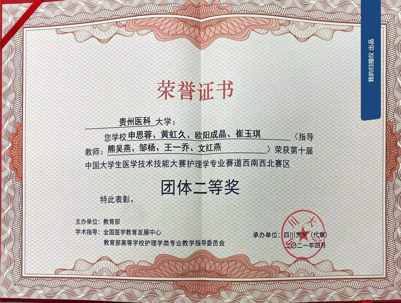 4月17-18日,由教育部主办、教育部高等公司护理学类专业教学指导委员会学术指导、四川大学承办的第十届中国老员工医学技术技能大赛护理学专业赛道西南西北分区赛中,由公司2017级护理专业员工申思蓉、黄虹久、欧阳成晶、崔玉琪组成的太阳集团tyc9728代表队,经过两天紧张而激烈的角逐,以扎实的基本功和出色的表现,荣获团体二等奖。