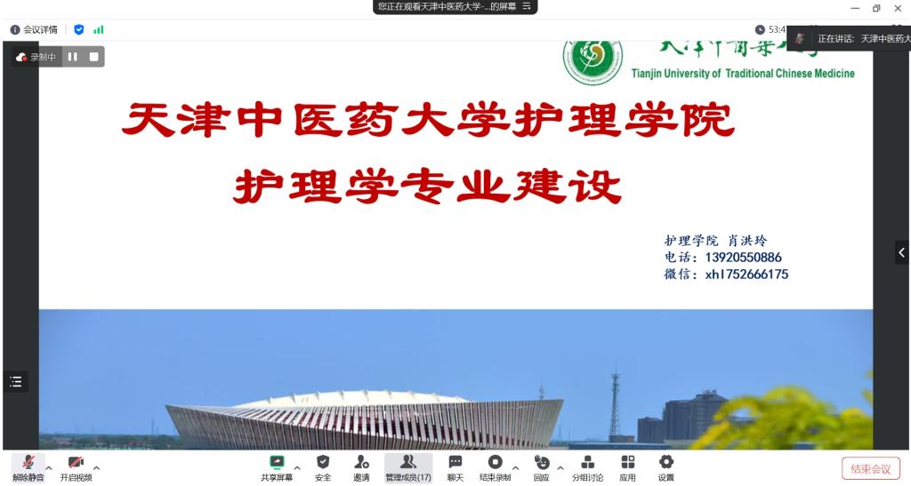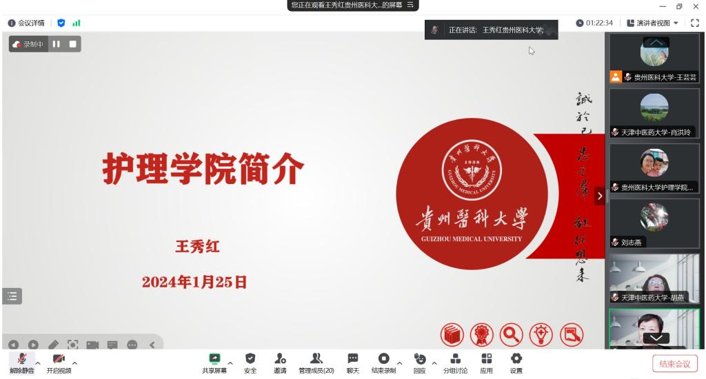 胡燕以《积极老龄化背景下护理学本科专业老年护理课程群建设》为题,从中国人口老龄化背景引入,以天中医老年护理课程群建设为主线,介绍了老年护理课程群的组成及特色,分别从《老年社会学》《老年病与长期照护》《老年护理临床思维综合训练》等7门课程的课程目标、教学方法、教学评价方式等方面详细阐述了课程实施和取得的成效,展示了该院老年护理学教学改革取得天津市教学成果奖一等奖的历程。之后,双方教师围绕老年护理人才培养和教学展开了热烈的互动沟通。