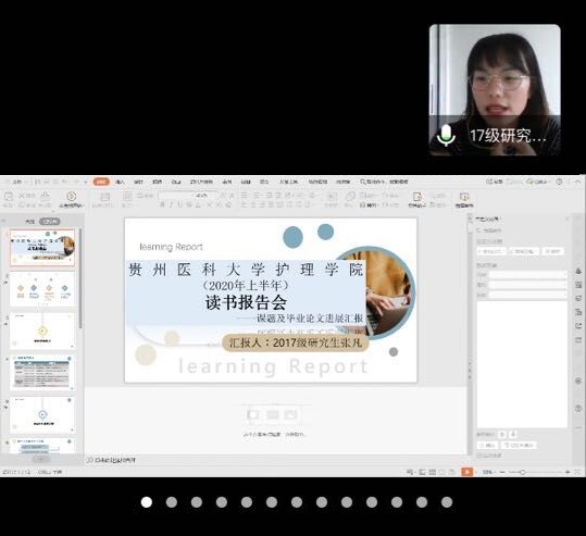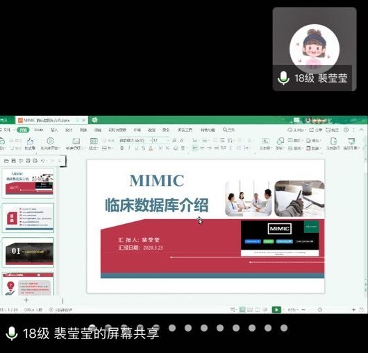 会议由护理公司党委副书记王秀红主持。本次读书报告会共分两个环节进行,首先由2017级方雯、覃瑛、张凡、李晓杰4位同学汇报了课题进展及学位论文完成情况,同学们结合自身完成课题和学位论文撰写过程中的经验和体会做了分享和交流。随后导师和同学对4位同学的汇报进行了点评。接下来的环节,2018级研究生张丽娟和裴莹莹分别以PPT形式进行了15分钟的读书报告汇报。张丽娟以“冰山理论”为题,分享了冰山理论核心观点及在护理研究领域的应用,裴莹莹以“MIMIC数据库介绍”为题,较为系统介绍了MIMIC数据库的使用。导师们根据员工的综合表现进行线上面对面点评,同时通过问卷星对员工汇报内容就选择意义、内容掌握、延伸拓展等方面进行综合考评,作为公司产品学术综合成绩评定参考。