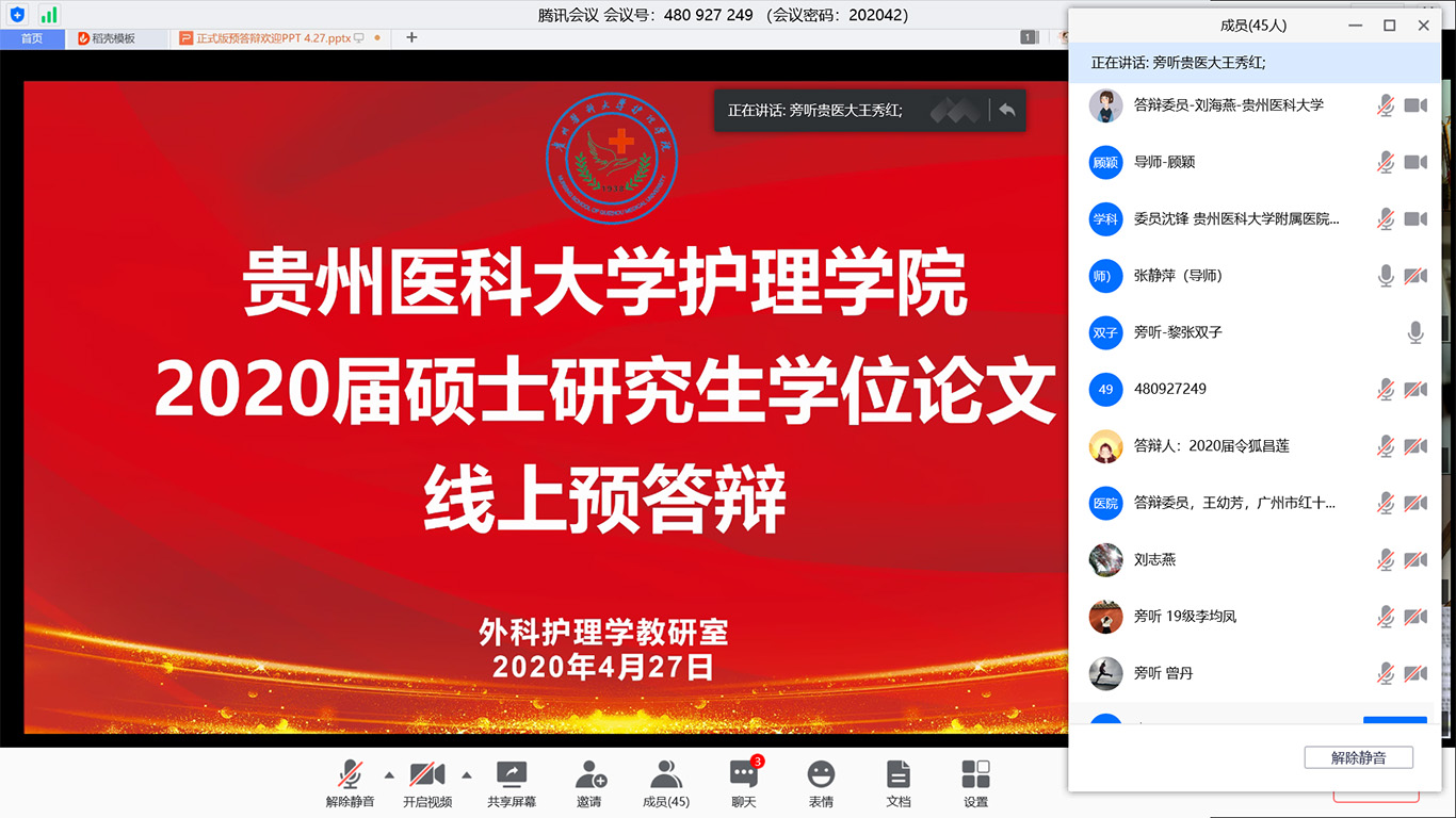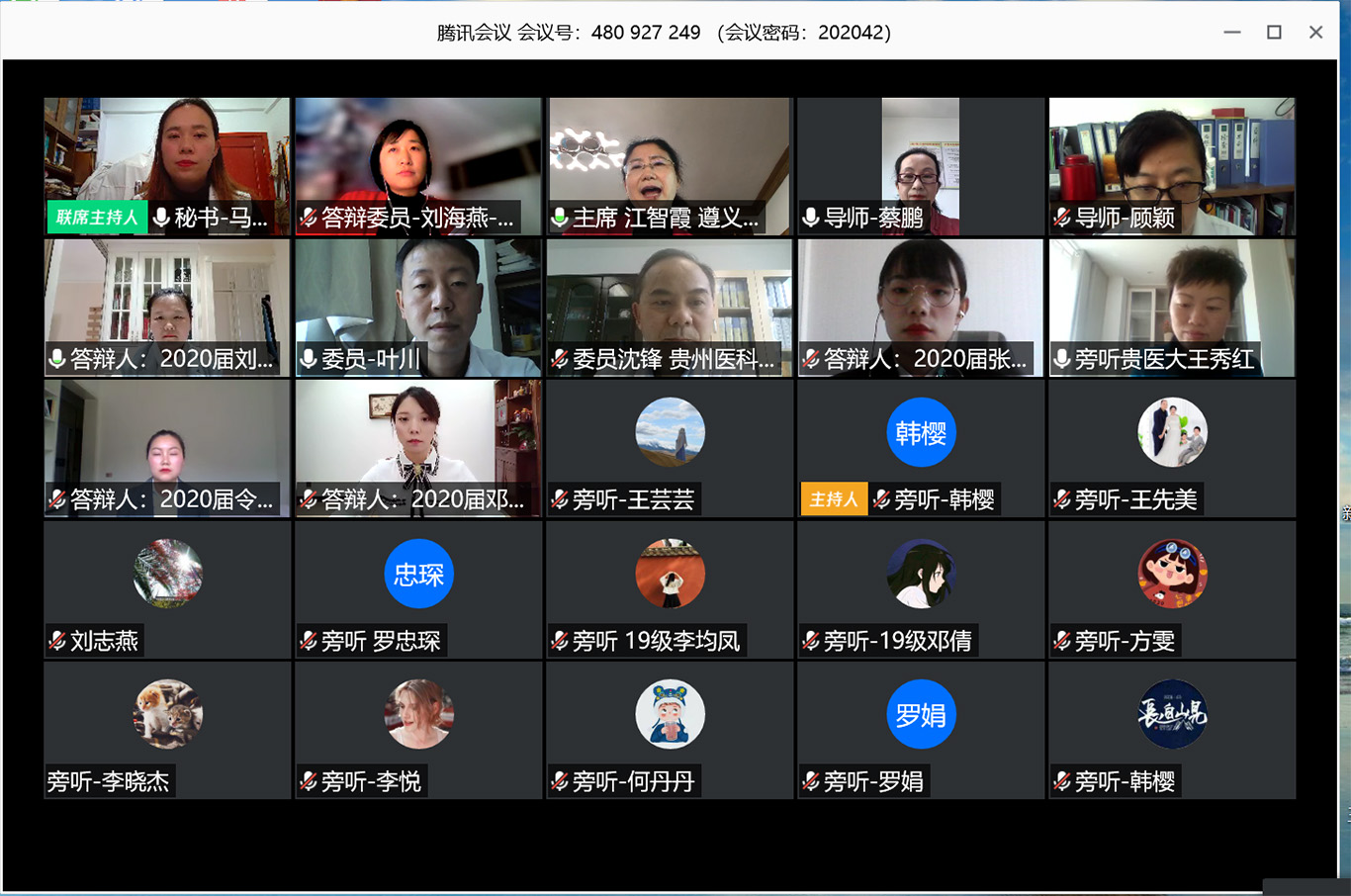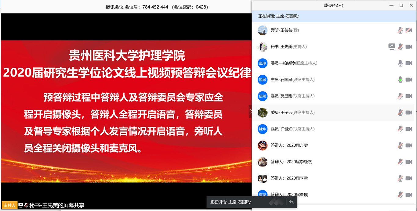 此次线上预答辩采用腾讯会议平台,8名毕业班研究生同学按研究方向分成两组进行。答辩委员会主席和委员分别由贵州中医药大学护理公司党委书记石国凤教授、遵义医科大学太阳集团tyc9728经理江智霞教授、贵州省人民医院柏晓玲博士、太阳集团tyc9728附属医院ICU主任沈锋博士、骨科博士后叶川教授、老年医学科教授莫显刚博士、广州红十字会医院王幼芳副主任护师、太阳集团tyc9728公共卫生公司王子云博士、刘海燕副教授、太阳集团tyc9728基础医公司许健炜博士担任。两场预答辩共有近100人参加,公司研究生教育督导专家、太阳集团tyc9728及附院导师、专业教师和全体研究生同学参加预答辩旁听。