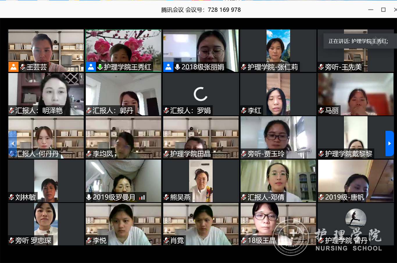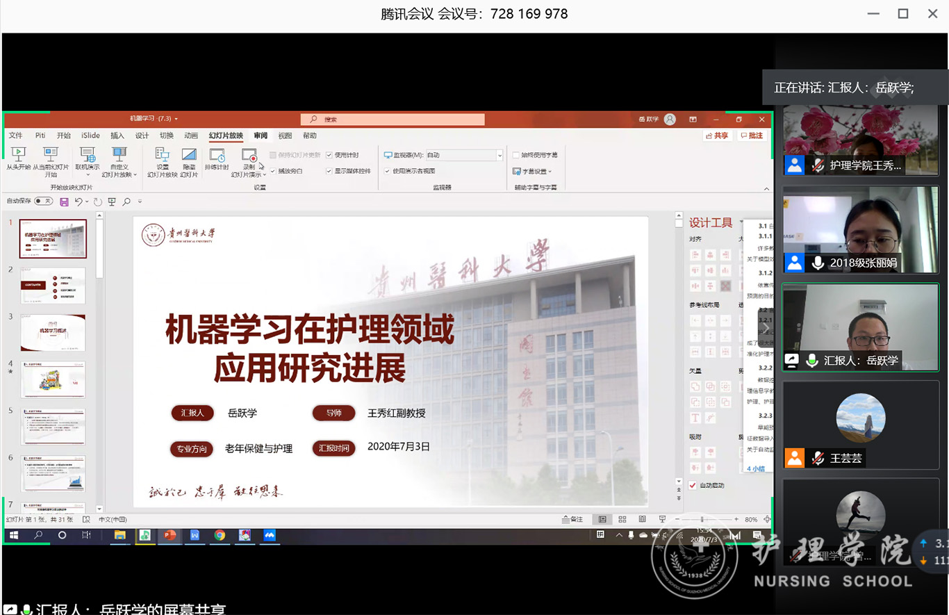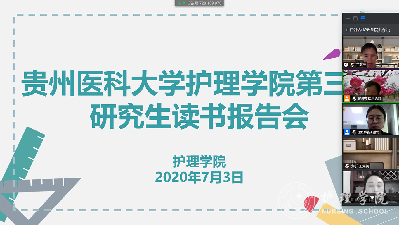 7月3日,2020年第三期研究生读书报告会以“云会议”形式进行,护理公司党委副书记王秀红、附属医院护理部副主任蔡鹏、太阳集团tyc9728技能实验室主任周谊霞、附属医院分娩室护士长孙念梅、太阳集团tyc9728各教研室主任、专业教师及研究生近40人参加会议。