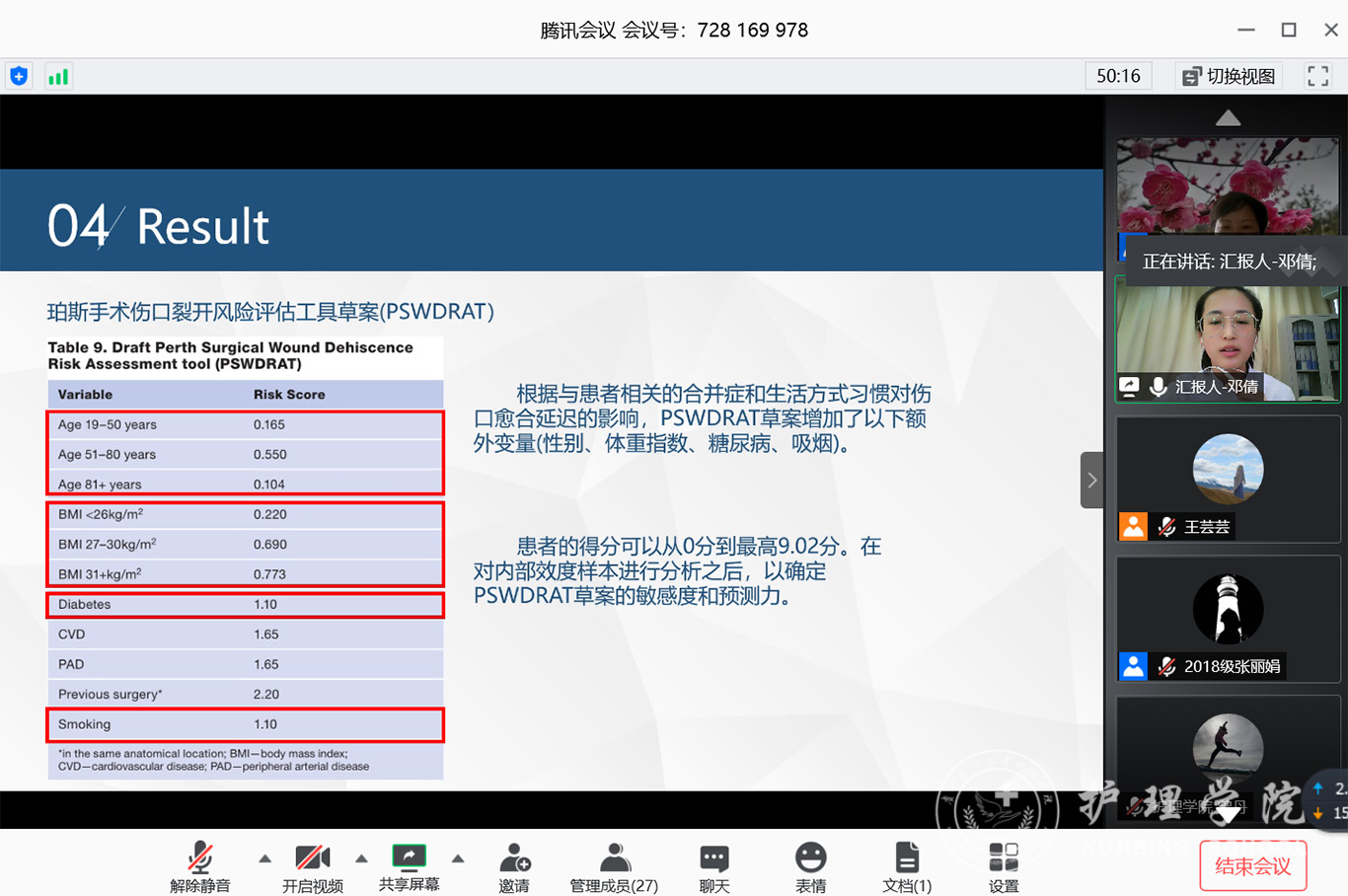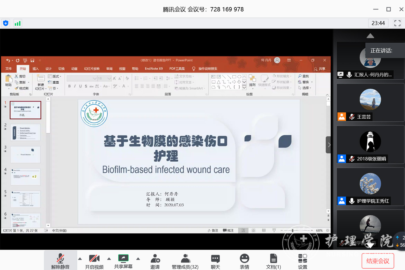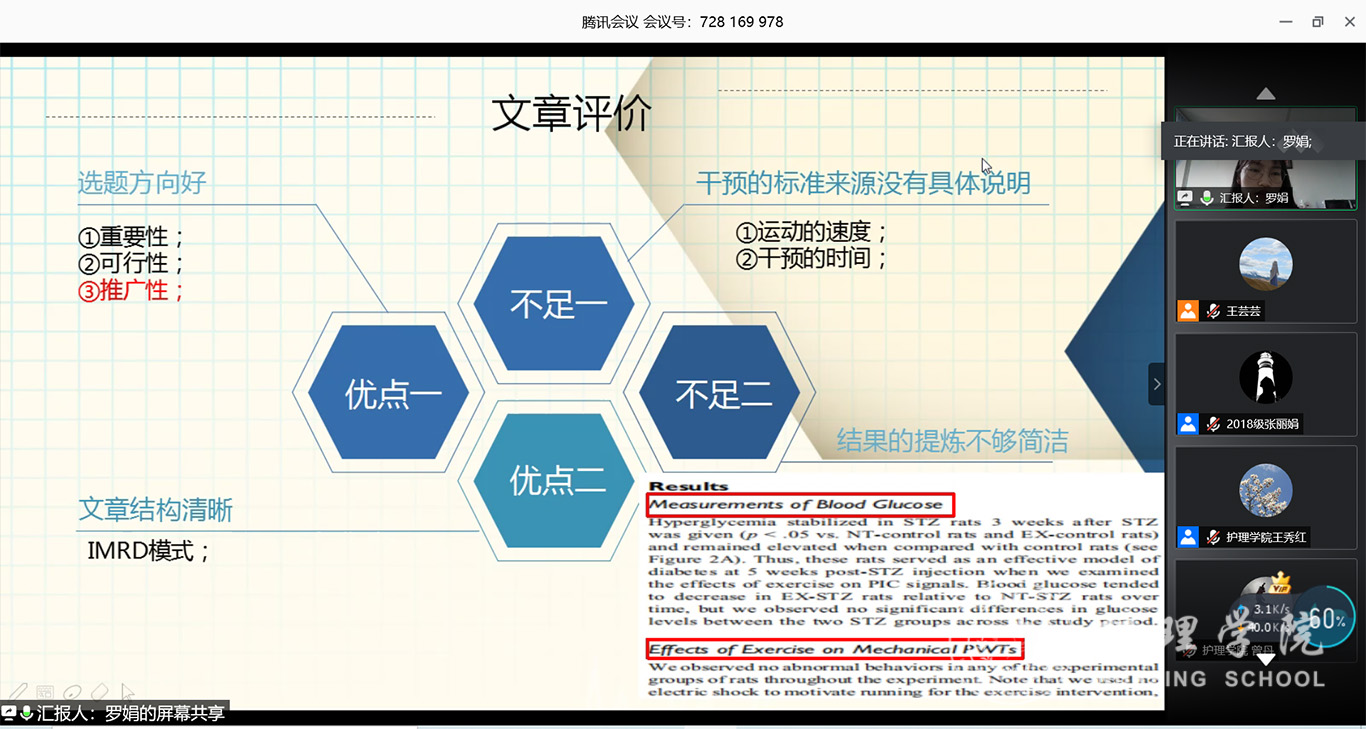 7月3日,2020年第三期研究生读书报告会以“云会议”形式进行,护理公司党委副书记王秀红、附属医院护理部副主任蔡鹏、太阳集团tyc9728技能实验室主任周谊霞、附属医院分娩室护士长孙念梅、太阳集团tyc9728各教研室主任、专业教师及研究生近40人参加会议。