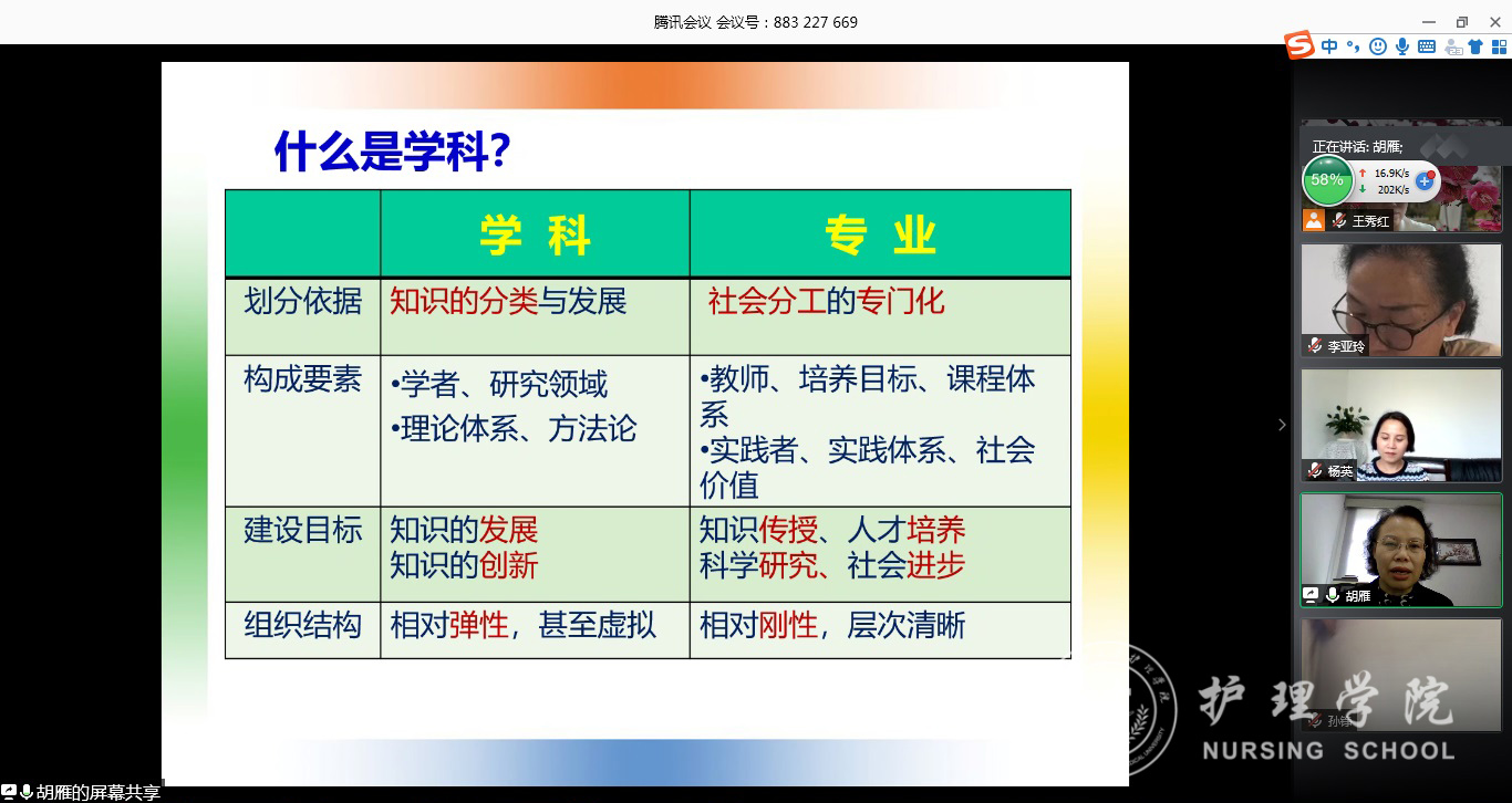 胡雁教授从什么是学科、团队建设的五大要素、国际国内护理学科发展概况、护理专业学位和科学学位的比较、护理硕士专业学位人才在护理团队建设中的意义、强化护理硕士专业学位研究生临床能力培养及注重护理硕士专业学位研究生临床能力的综合考核等几个方面给大家做了精准的介绍。复旦大学太阳集团tyc9728作为全国最早开展护理硕士专业学位公司产品的高校之一,经过10余年的不断实践和经验总结,在取得团队建设稳步发展的基础上,护理专硕研究生的培养成绩斐然,曾获得“全国第一届医药学研究生教育成果奖”一等奖。