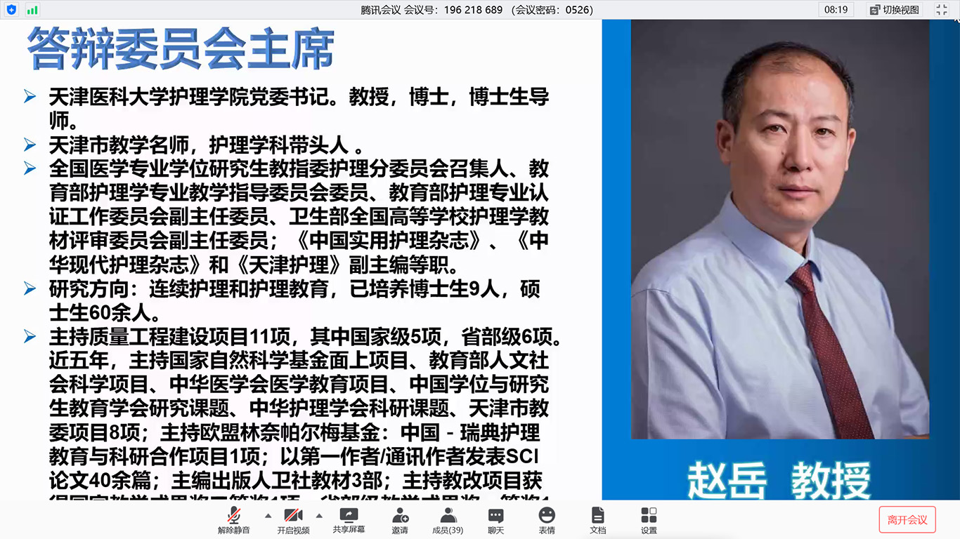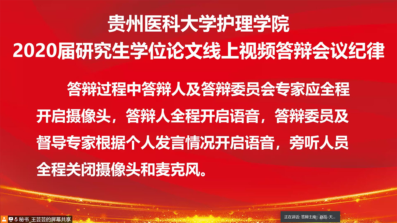 本次答辩有幸邀请到天津医科大学护理公司党委书记、博士生导师、全国医学专业学位研究生教指委护理分委员会召集人、教育部护理学专业教学指导委员会委员、教育部护理专业认证工作委员会副主任委员赵岳教授担任答辩主席,贵州中医药大学护理公司党委书记、国家自然科学基金评审专家石国凤教授、遵义医科大学太阳集团tyc9728经理江智霞教授、太阳集团tyc9728公共卫生公司王子云博士、太阳集团tyc9728基础医公司徐键炜博士担任答辩委员,太阳集团tyc9728王芸芸讲师担任答辩秘书。太阳集团tyc9728及附属医院导师、专业教师和全体研究生同学近50人旁听学习。