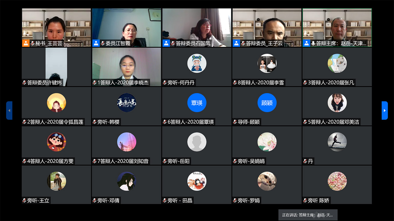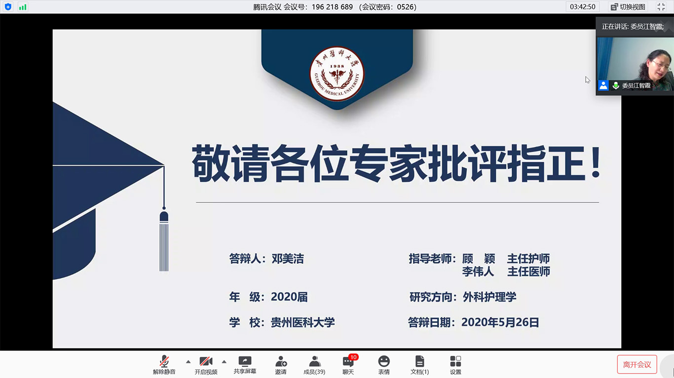 2020届共有8名硕士研究生参与论文答辩,答辩论文包括围绕护理临床疾病与基础研究方向的国家自然科学基金子课题——橙皮素对动脉粥样硬化作用的实验研究及临床验证、橙皮素调脂和抗动脉粥样硬化作用的实验及临床初步研究;研制评价工具并开展实际运用的答辩论文——ICU护士对有创机械通气撤机指征知信行问卷的研制及应用、多发伤患者ICU护理监测评估量表的研制与应用、ICU护士对医疗器械相关性压力性损伤知信行问卷的研制及应用、基于Servqual模型探讨血透中心患者对护理服务质量评价的研究;以及当前热点研究方向老年保健与护理和延续性护理相关的论文——单侧全膝关节置换老年患者术前衰弱状态及其对康复结局的影响研究、认知—行为干预在门诊颞下颌关节紊乱患者延续性护理中的应用研究。