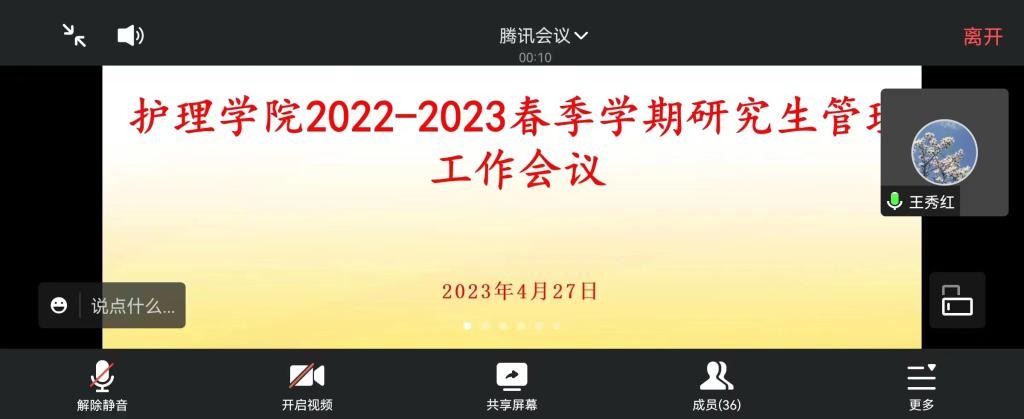 4月27日,太阳集团tyc9728通过线上形式召开了2022-2023春季学期研究生管理工作会议。护理公司党委书记杨英、经理李亚玲、副经理刘志燕、副经理王秀红、教研室主任(含实验室主任)、研究生导师、教学科研管理科全体教师、研究生辅导员参加了会议,会议由2023届研究生毕业班辅导员吴俊主持。