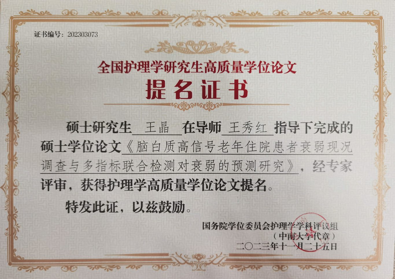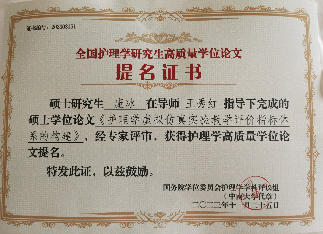 会议公布了前期由教育部护理学学科评议组开展的“高质量学位论文评选工作”情况及结果。来自全国70余所院校、2020届到2023届232篇博士硕士优秀论文进入评选目录。由研究生导师王秀红指导的2021届护理学学硕研究生王晶、2023届护理学学硕研究生庞冰的学位论文获评高质量学位论文提名奖。
