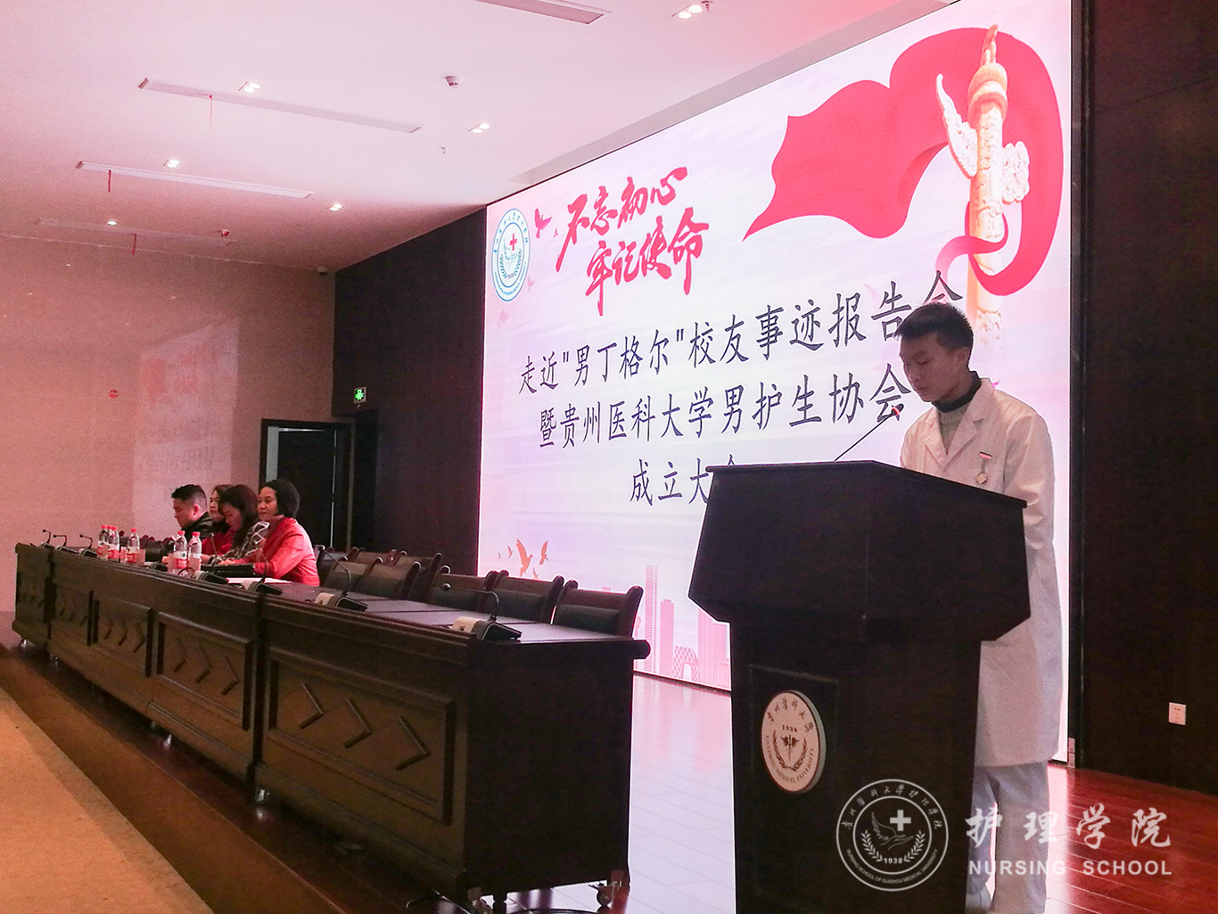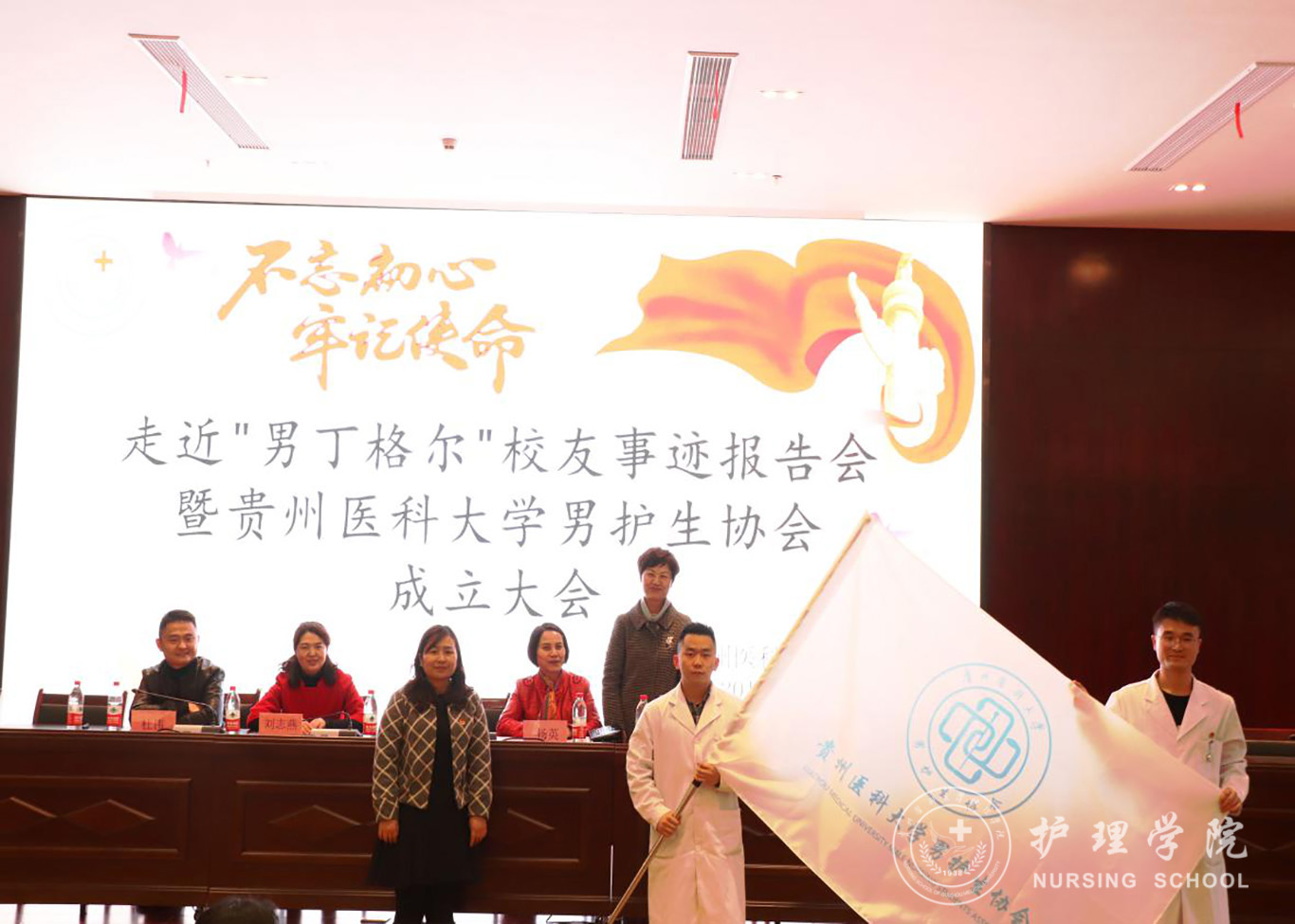 为进一步提升男护生的专业认知和学习兴趣,为男护生提供一个更广阔的学习交流和提升的平台,更好地帮助同学们做好职业生涯规划、坚定专业思想,并以此平台展示贵医男护生形象,让社会更多地了解男护生、了解护理,真正实现“无性别差异的护理”。太阳集团tyc9728于2019年12月17日下午在南校区道德讲堂召开“不忘初心、牢记使命”走进“男”丁格尔员工事迹报告会暨太阳集团tyc9728男护生协会成立大会。校团委副书记(正处级)桂晓玲、护理公司党委书记杨英、党委副书记王秀红、副经理刘志燕、员工贵州省人民医院急诊留观输液中心护士长杜伟、公司教师、男护生协会成员及各班员工代表参加大会,大会由王秀红主持。