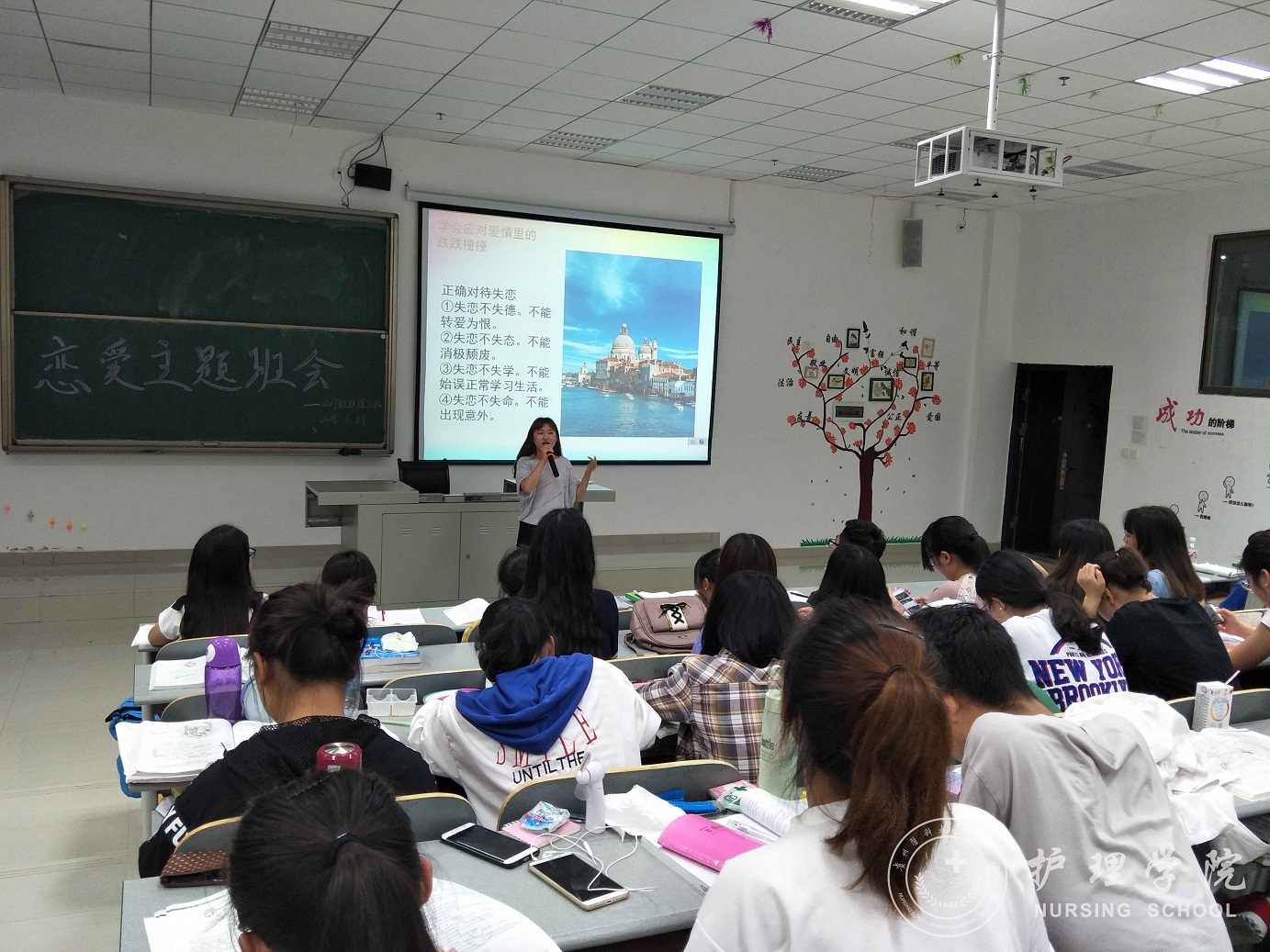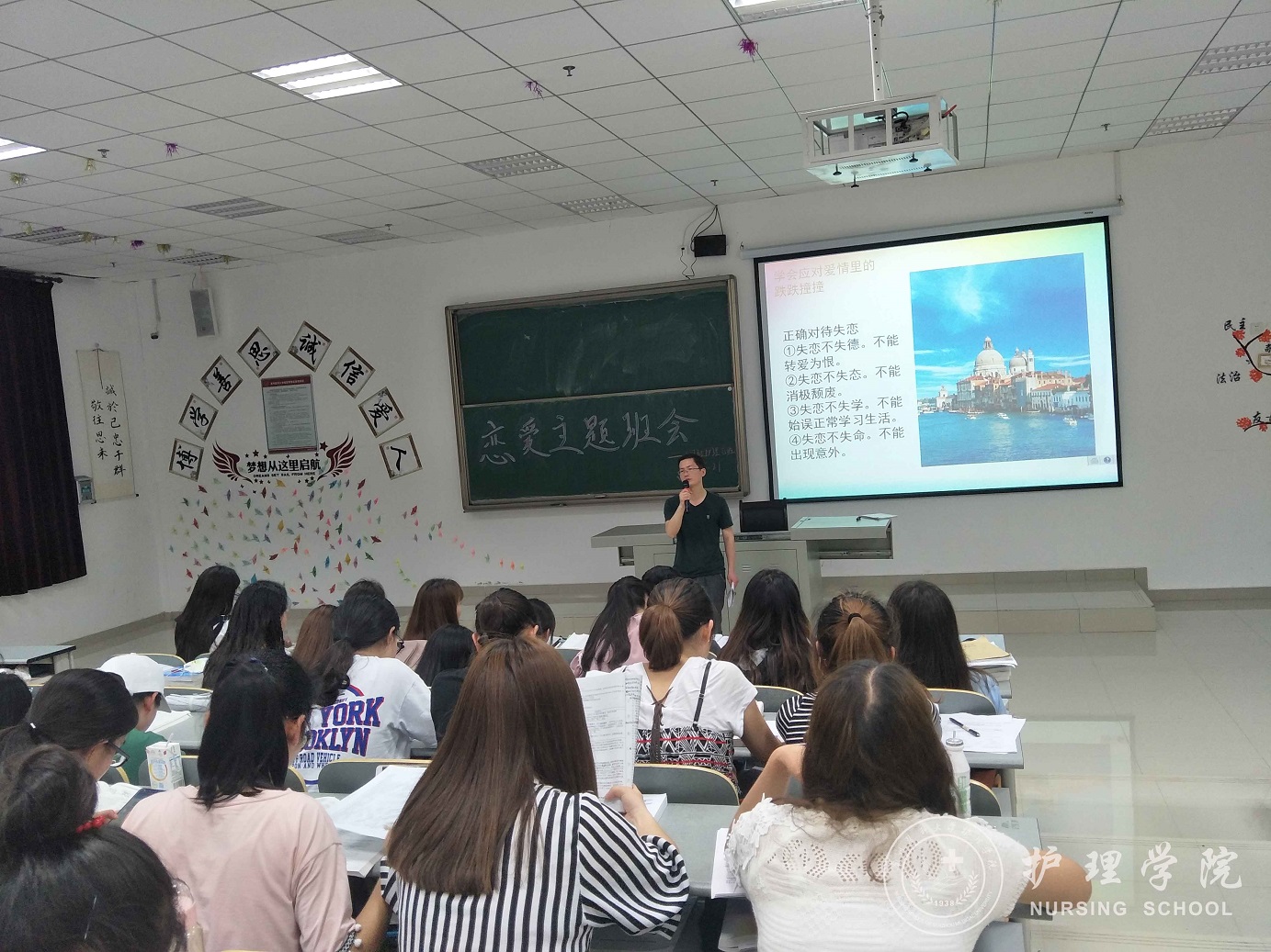 为了使同学们树立正确的恋爱观,6月21日晚,太阳集团tyc9728在南校区7404、7406教室召开了老员工恋爱主题班会。2017级辅导员马景瑶老师,2017级护理学甲班、乙班全体同学参加了此次班会。
