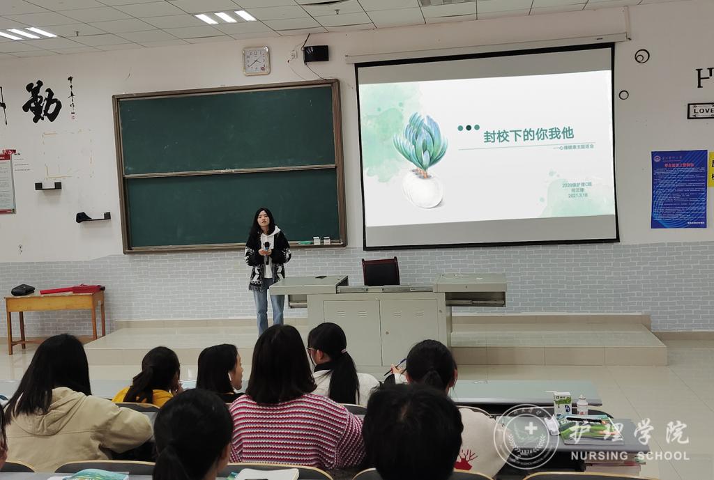 3月19日,2020级护理学C班全体同学在x4103教室开展“封校下的你我他”心理主题班会,全班同学参加本次会议,本次班会由班级心理委员何云珊主持。