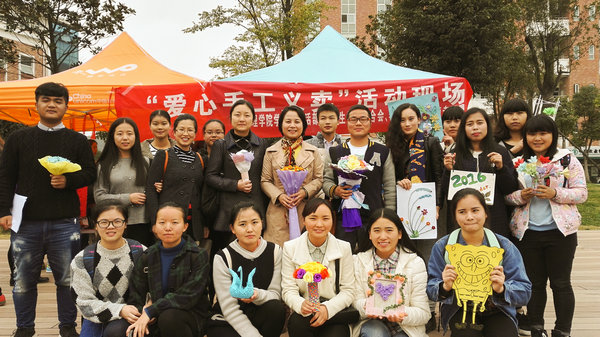 11月18日中午12点,由公司员工会生活部、老员工社团联合会、希望工程爱心社使者联盟开展的“与爱同行”手工大赛暨爱心义卖活动在“悯农堂”前开展。本次活动旨在丰富同学们的老员工活,提高大家的动手能力和创新能力,营造良好的校园文化气氛,给同学提供一个平台去奉献自己的爱心。护理公司党委副书记杨英、员工科科长曾敏、辅导员王晓玲、李海林、毕丽参与本次活动评选及义卖。