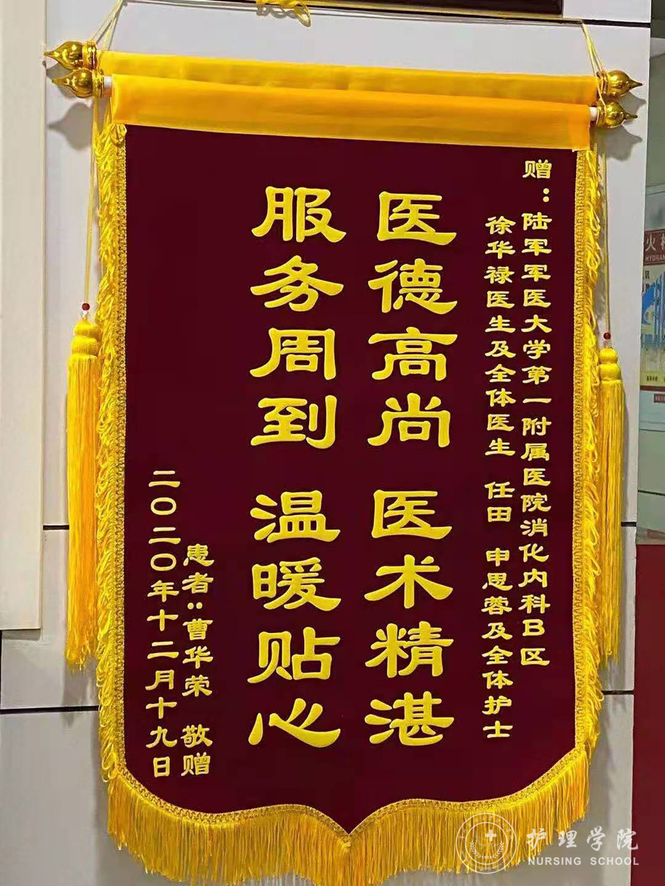 申思蓉,2017级护理学丙班员工,重庆陆军军医大学西南医院实习生,实习期间和病人交流过程中注重与病人的友好相处,积极向经验丰富的老师们学习,夯实自己的专业知识,从各方面增强自己的综合能力,她说轮转到了消化内科B区,刚进科室里,就目睹了病人痛苦呻吟的样子,患者的疼痛大多发生在半夜,时常会被疼痛所惊醒,每次在他不舒服的时候就会去陪伴他,进行相应心理安慰,也会从饮食作息等方面让患者改正他的一些坏习惯。出科后的第14天,同学告诉她有位患者给她送了面锦旗,申思蓉说:“当我点开同学给我拍的照片后,看到最后那一列署名时,震惊的同时眼眶也跟着湿润了,我明白了原来之前我所做的一切都是被患者所认可的,原来也可以有那么一天,我的名字被一名患者这么深深地记住”。此后,申思蓉更深刻地体验到了这面锦旗给她带来的正能量,这也更加坚定了她对从事护理行业的信念。