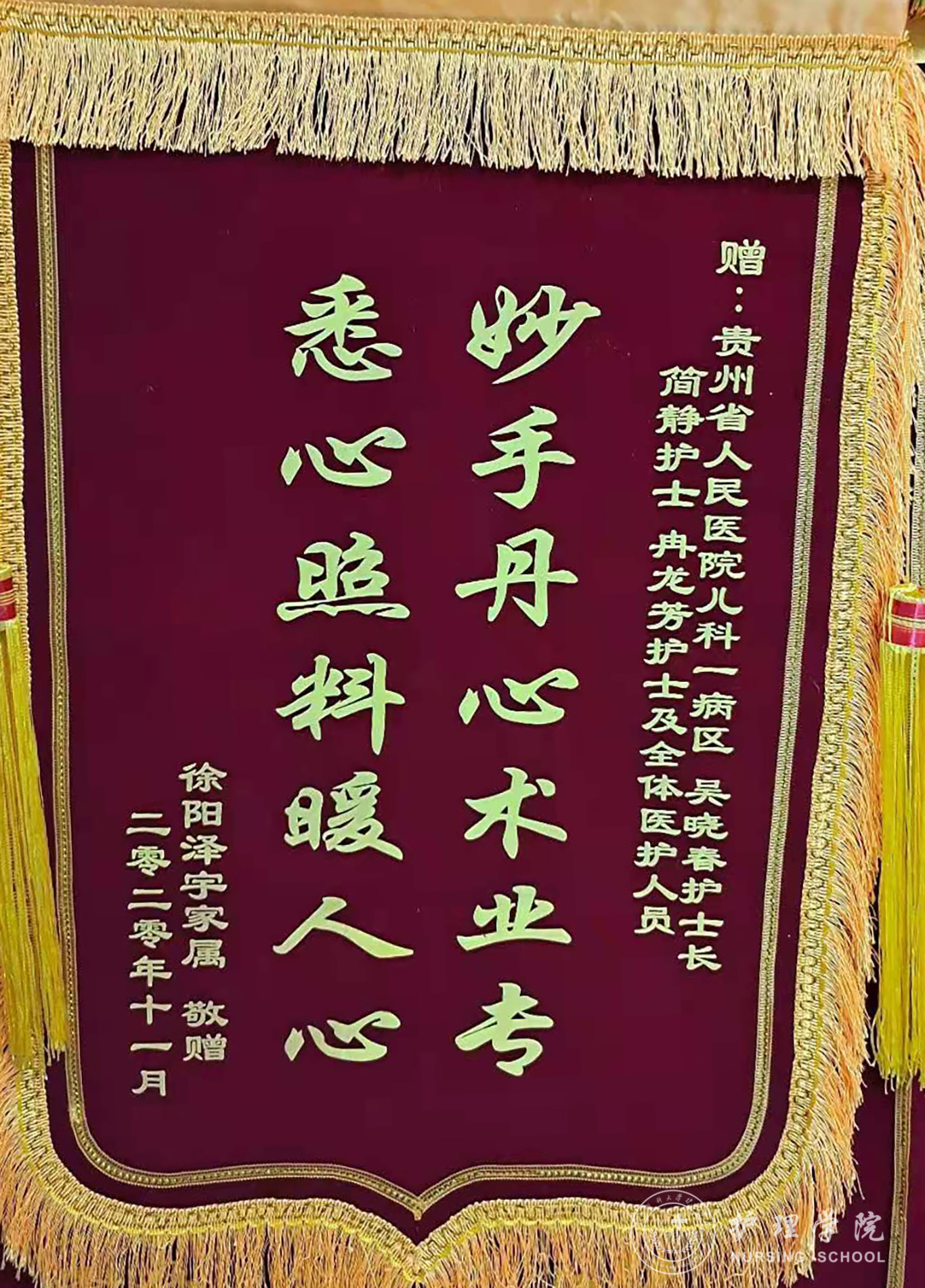 冉龙芳,2017级护理学乙班员工,贵州省人民医院实习生,在儿科病区实习期间,在面临儿科护理治疗繁多,住院患儿多、设备不足的情况下,该同学合理安排所管辖床位患儿的超声雾化、振动排痰、输液等治疗时间和顺序,既保证患儿的治疗效果同时,最大化满足了患儿睡眠和休息。当患儿休息与治疗冲突时,同学耐心与家属沟通,取得护患之间的相互理解并根据患儿的休息习惯和脾性,为每位患儿都安排了其专属的治疗顺序。其管辖的患儿多康复出院,患儿家属赠与锦旗感激她悉心照料,赞扬了她的专业操作能力。冉龙芳说“我只是做了我应该做的,作为一名医护人员,我会不断提高自己的专业水平和科学文化素养,掌握为祖国建设,为病人服务的过硬本领和竞争能力,更好地为卫生事业贡献自己的力量,施展自己的才华。”