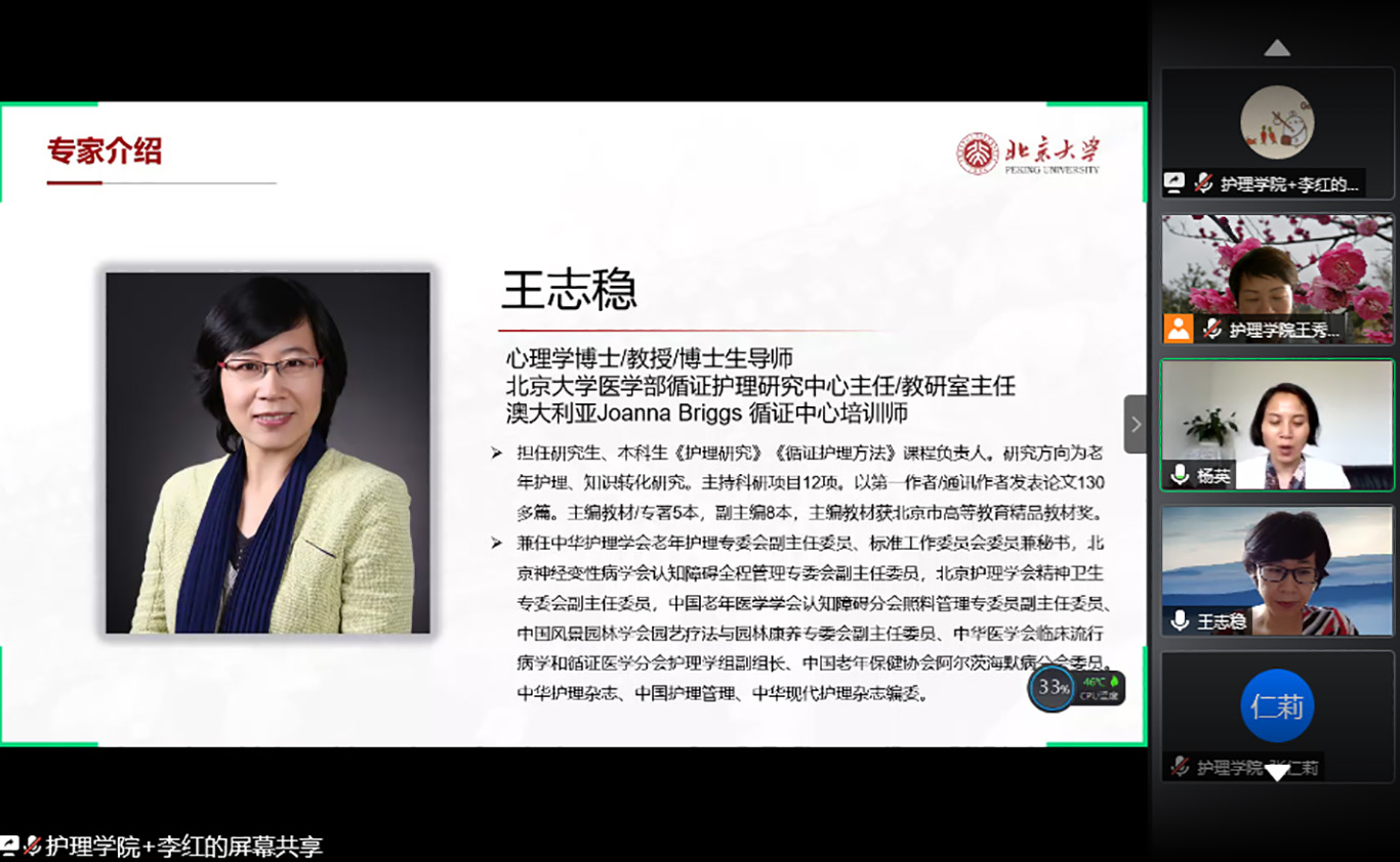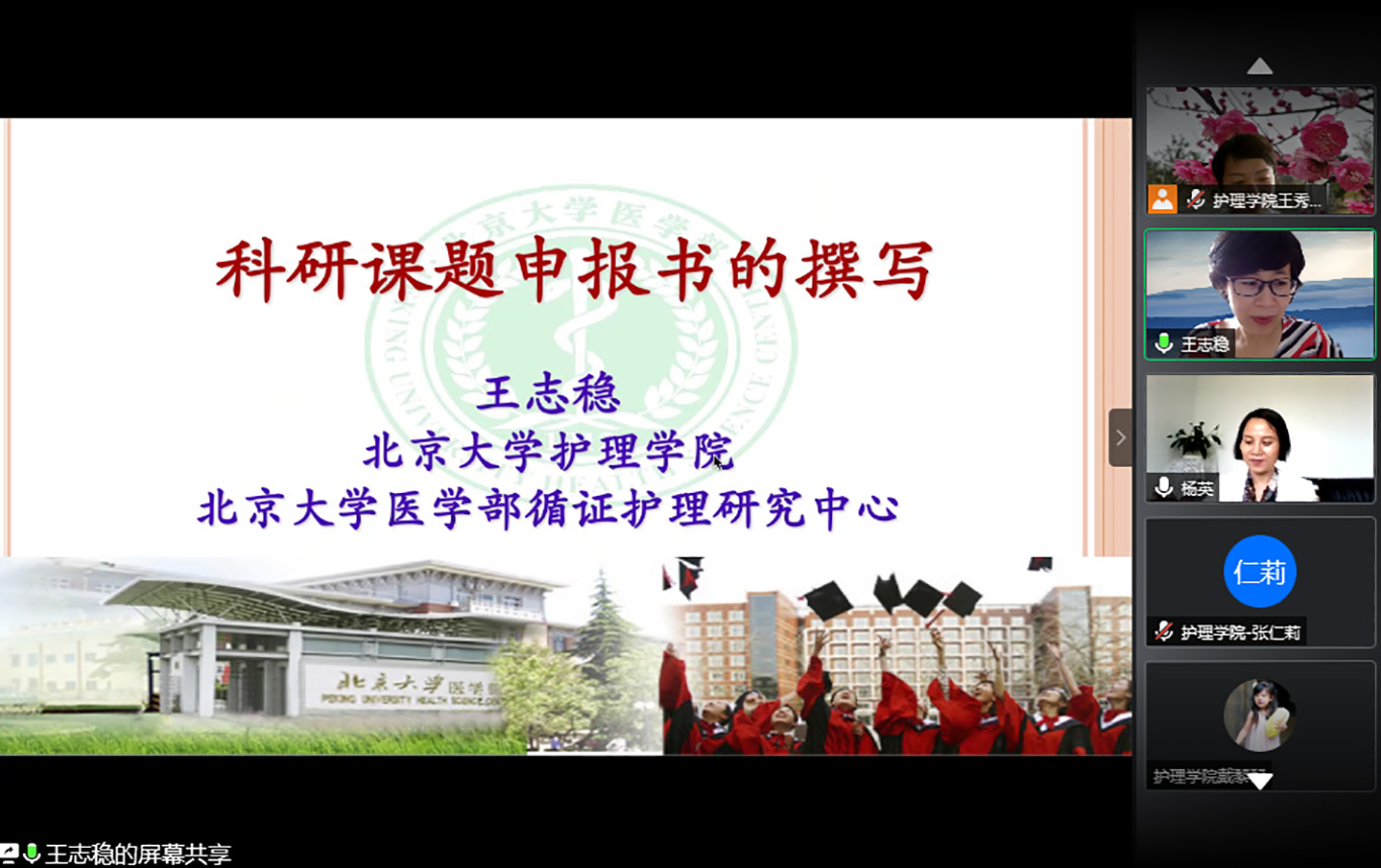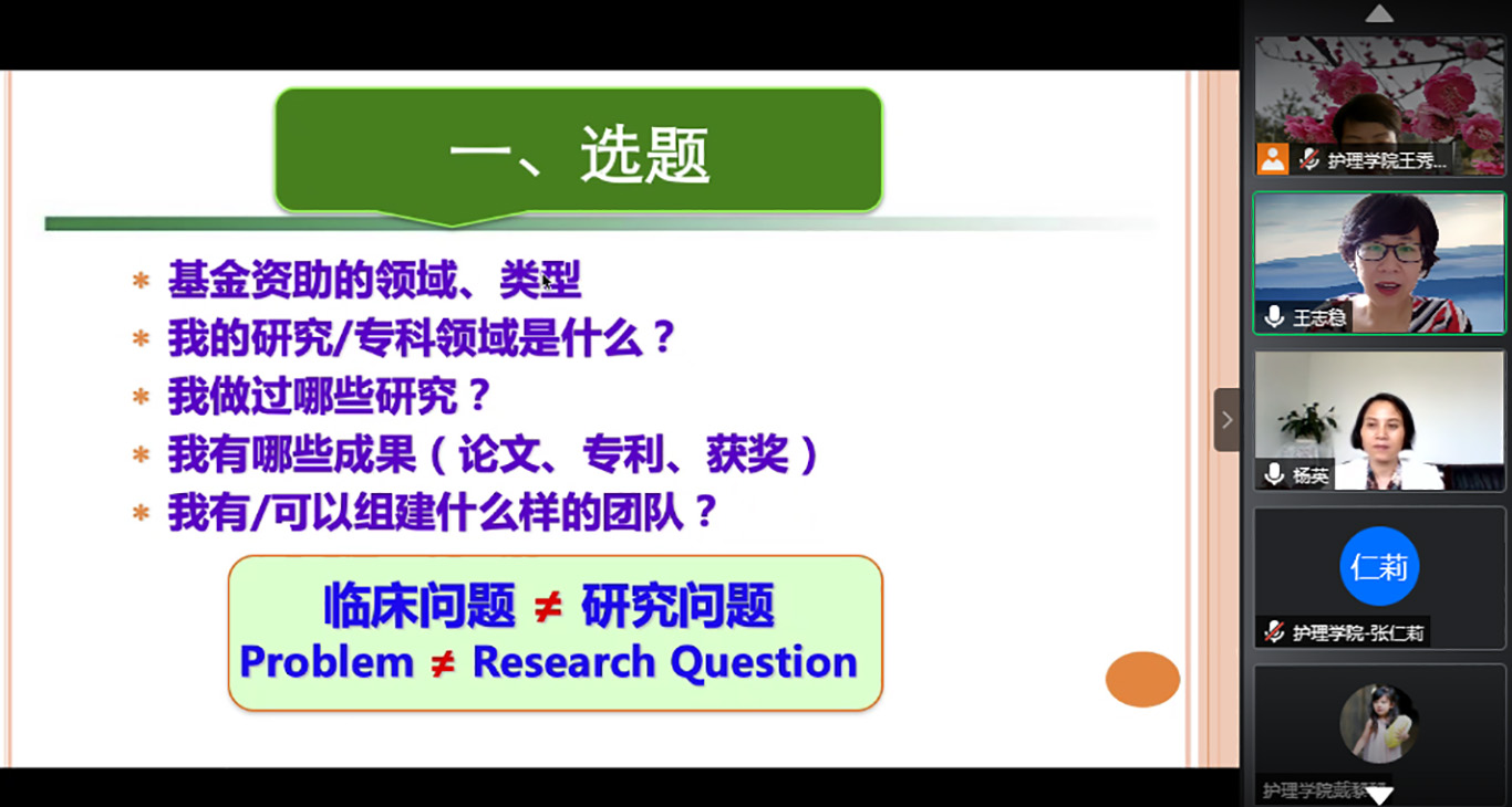 为进一步提升公司护理学科科学(教学)研究水平,加强护理学科内涵建设,促进护理学科科研(教学)团队的建设,培育新型护理学术(专业)人才,推动公司护理学科及各附属医院护理科研(教研)的总体发展。6月24日下午,北京大学太阳集团tyc9728博士生导师、循证护理研究中心主任王志稳教授受邀为公司护理教师及研究生开展了题为“护理科(教)研申报书撰写”的专题讲座。会议通过腾讯会议平台进行,太阳集团tyc9728及附属医院、第二附属医院、第三附属医院、附属白云医院等直属附属医院部分教师和研究生近100人参加了讲座,护理公司党委书记杨英主持会议。